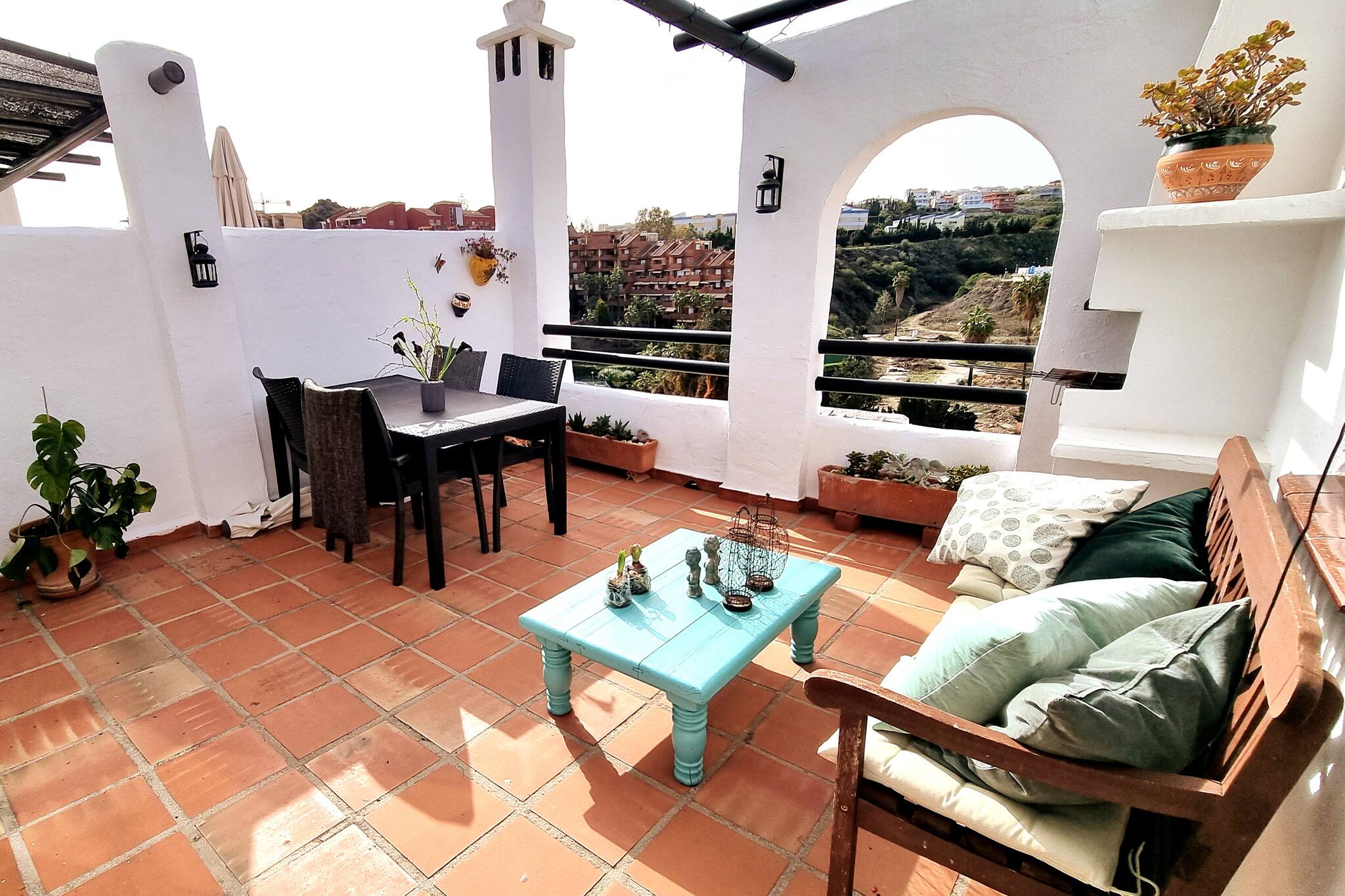 Amplio porche con cristal desmontable y gran terraza privada con barbacoa, comedor y 2 tumbonas.
