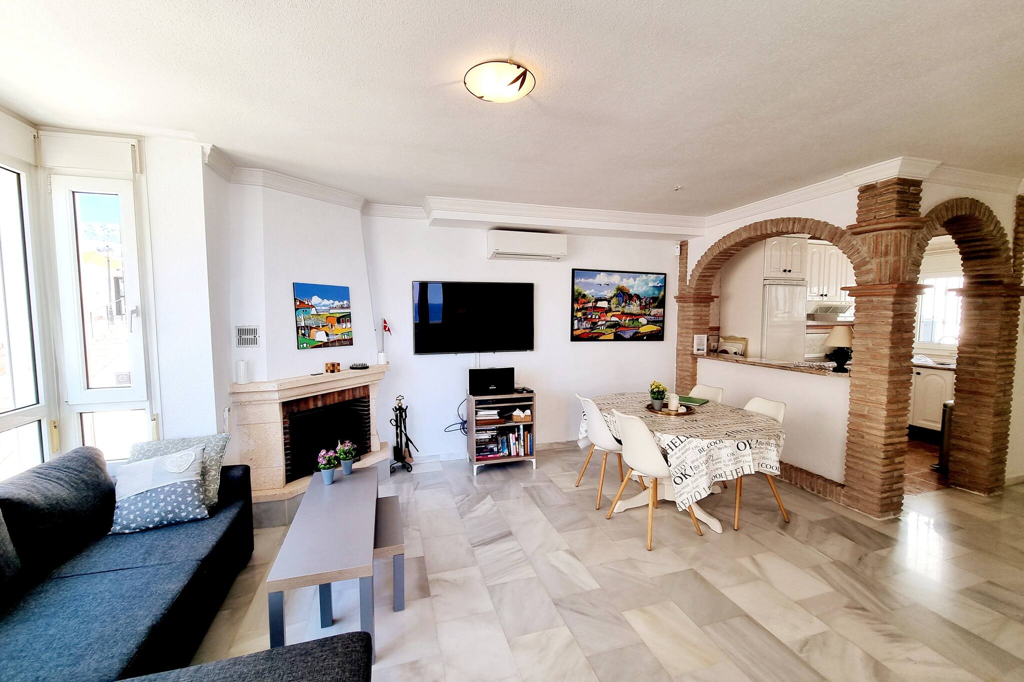 En el salón hay una zona de comedor, un sofá (sofá cama ) y una cocina abierta totalmente equipada. Salida al conservatorio con vistas al Mediterráneo donde podrá sentarse y disfrutar de las noches españolas. También hay un aseo en esta planta. Hay una TV con canales daneses, suecos, noruegos e ingleses. También Wi-Fi gratis.