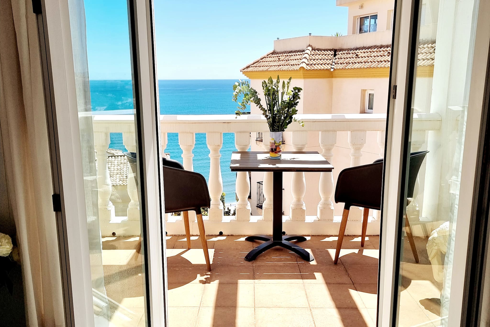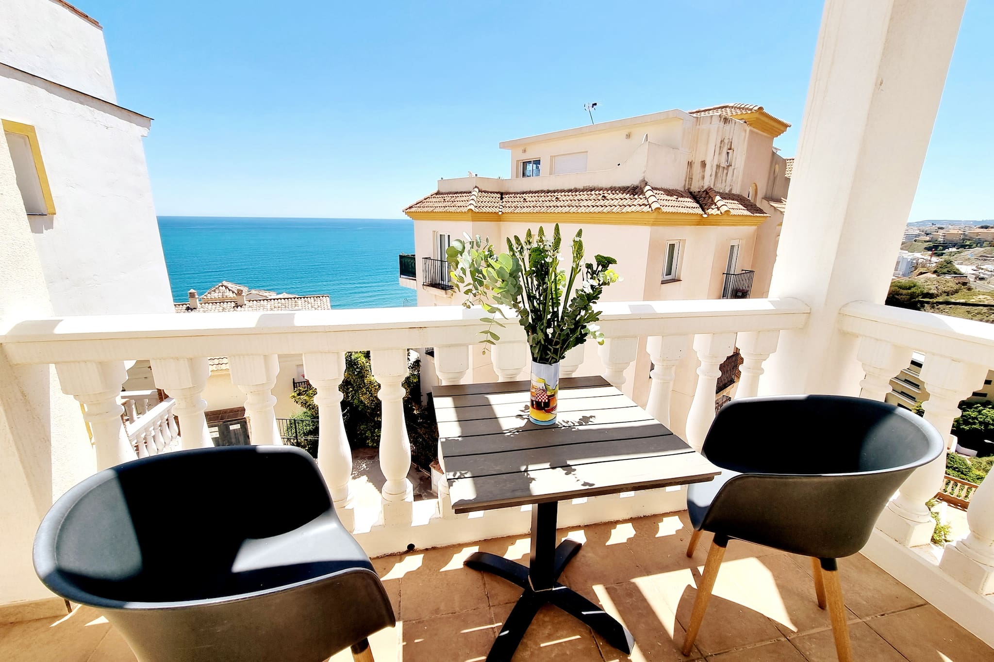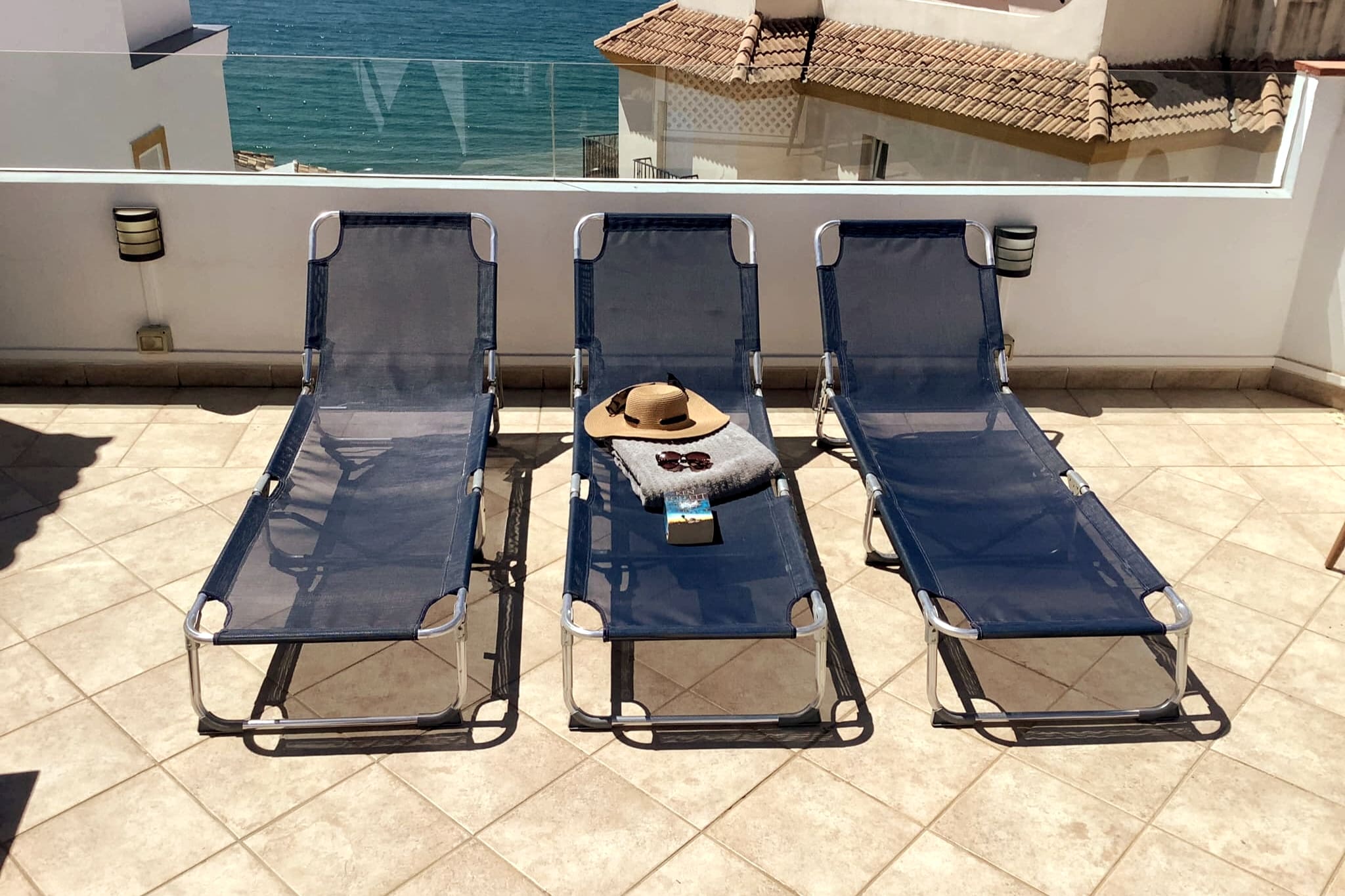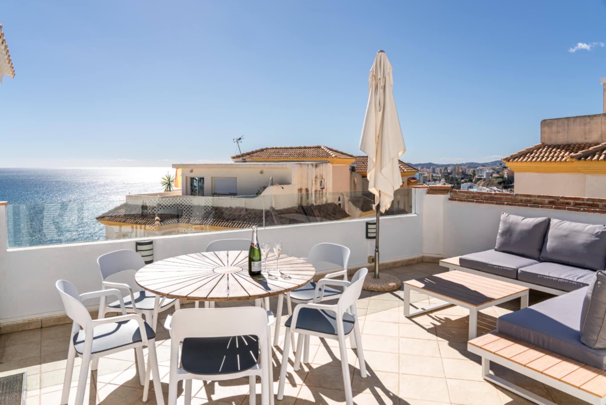 Hay una azotea con comedor para 8 personas, un par de tumbonas y una gran barbacoa. Desde aquí se tiene una vista fantástica de las montañas y el mar Mediterráneo.