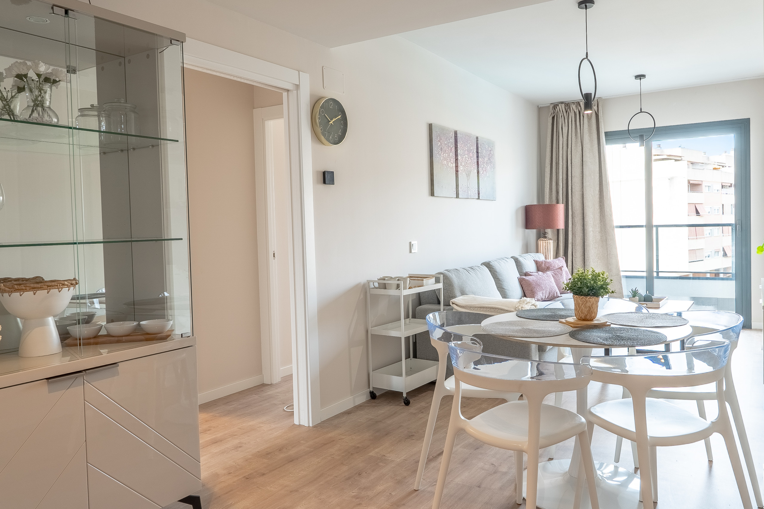 La cocina abierta está completamente equipada y conecta con un salón cómodo con zona de comedor para seis personas. Desde el salón se accede a una terraza con barbacoa eléctrica, ideal para comer al aire libre.