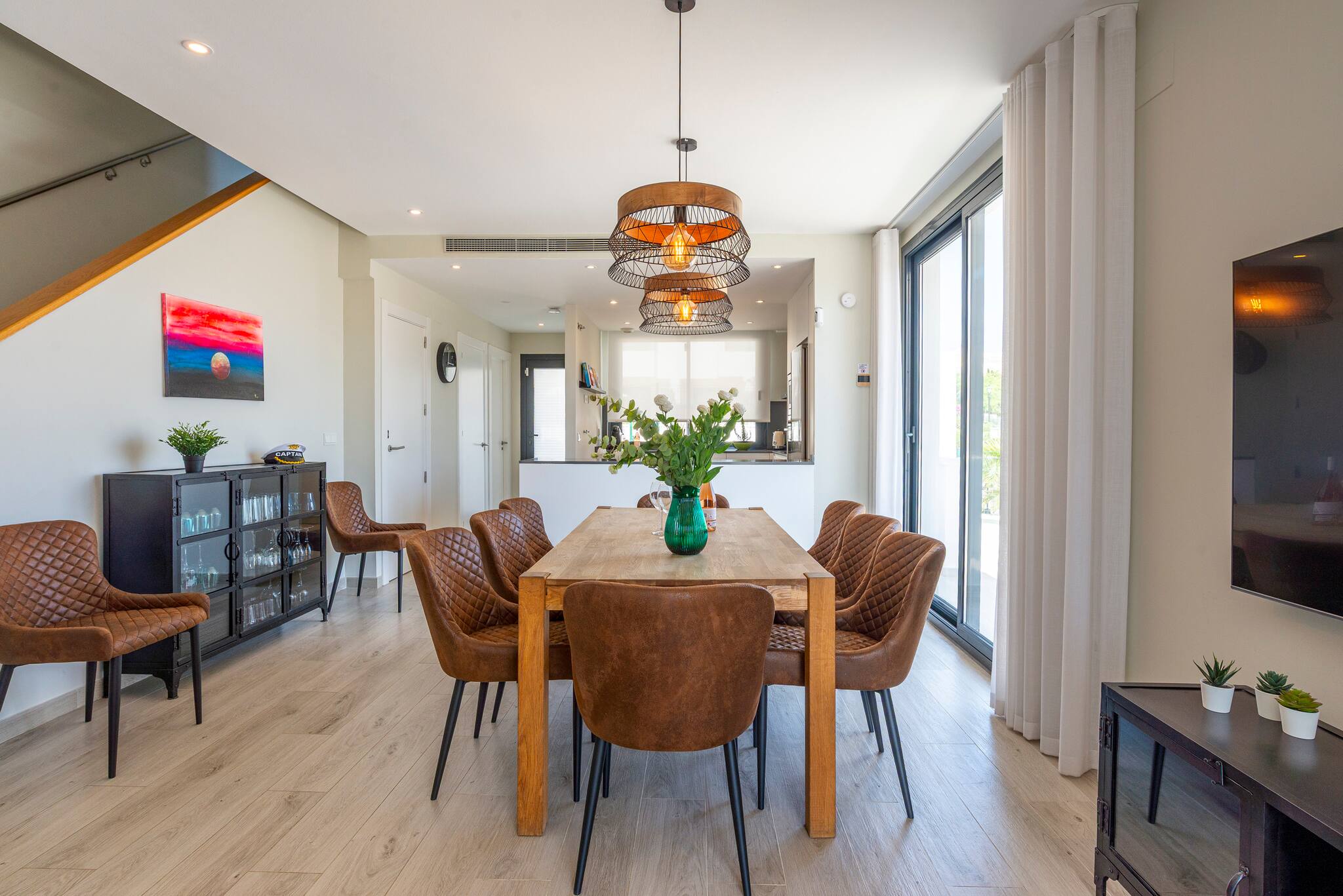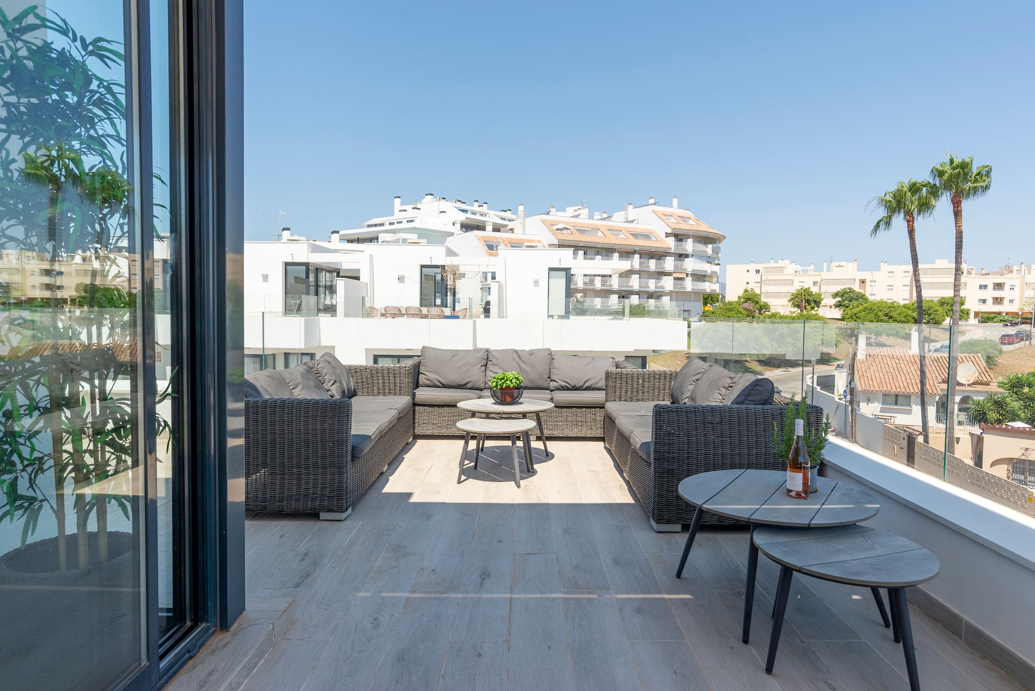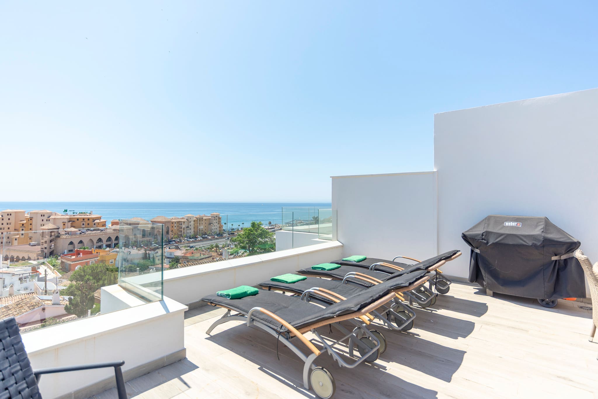 Si subes a la última planta, encontrarás una gran terraza privada en la azotea con zona de comedor, muebles de salón, tumbonas y barbacoa. Desde aquí tendrás una vista fantástica de la playa y las montañas, y la playa está a solo 5 minutos caminando.