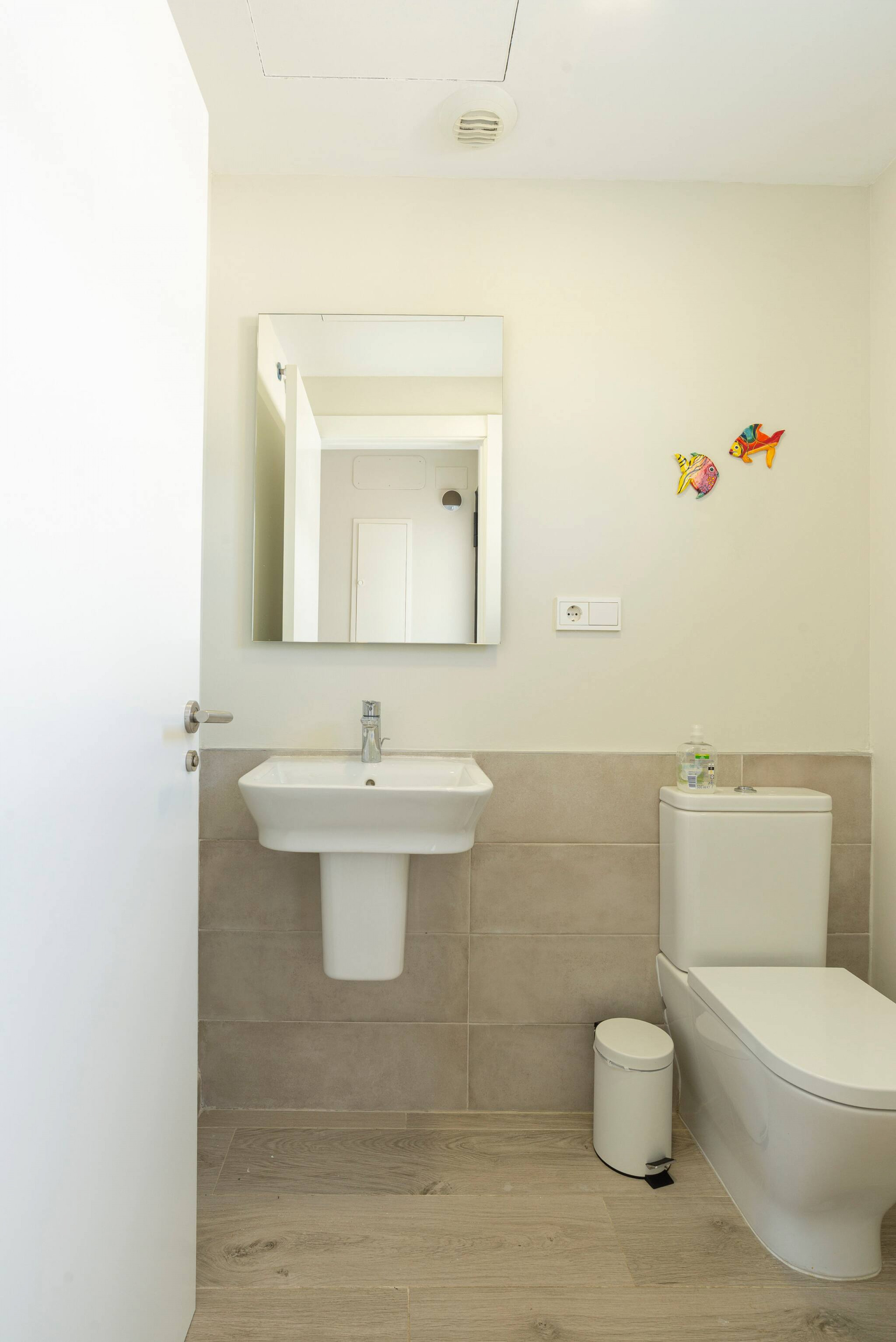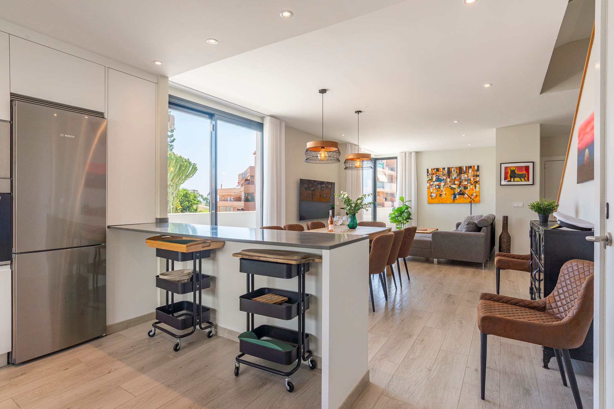 En la planta donde tenemos la entrada, hay un salón comedor con cocina abierta totalmente equipada. En esta planta también tienes un aseo y acceso a otra terraza con zona de comedor, barbacoa y una zona más pequeña con 2 tumbonas.