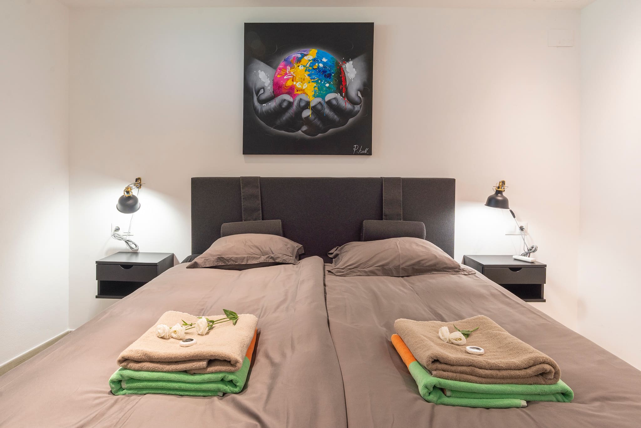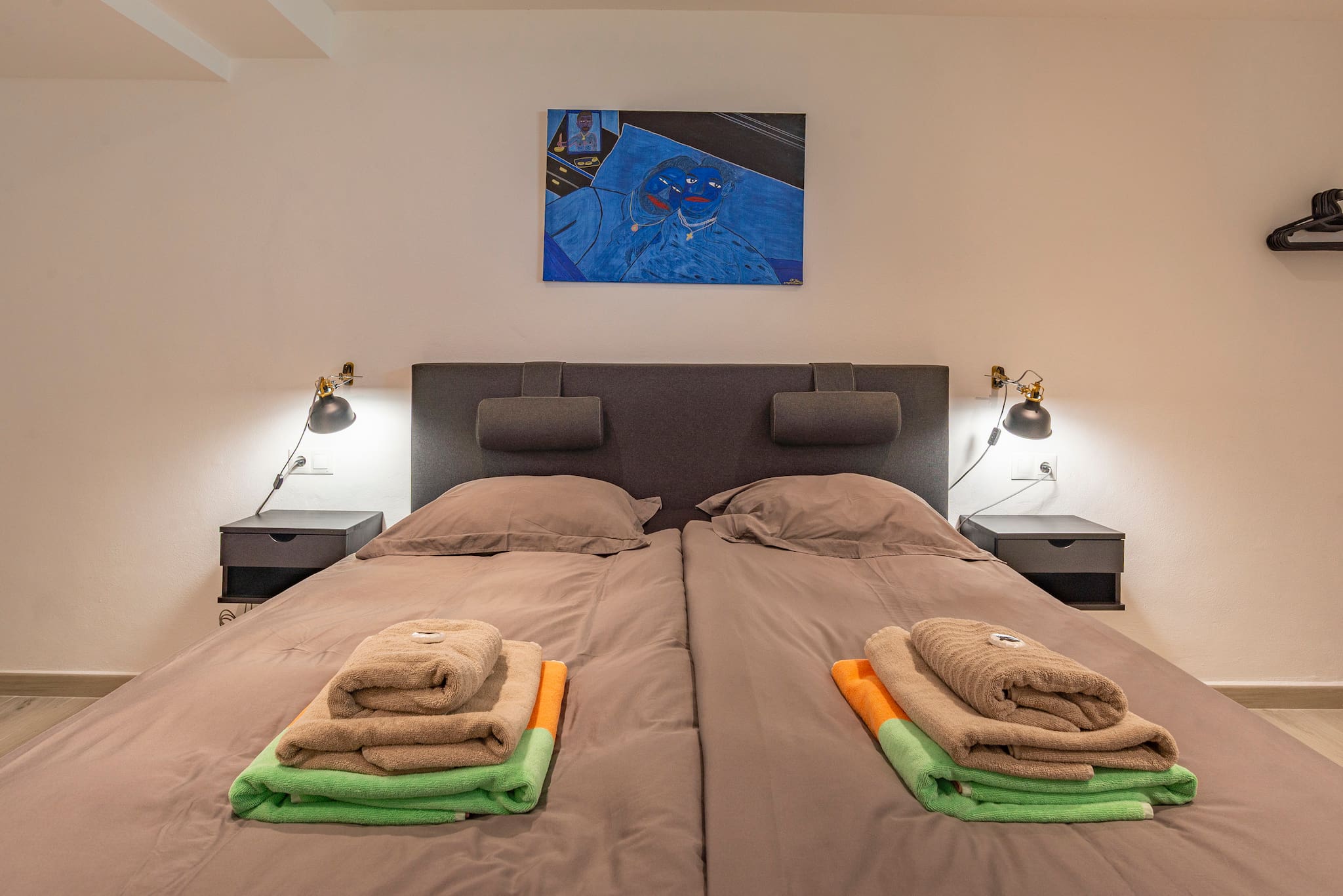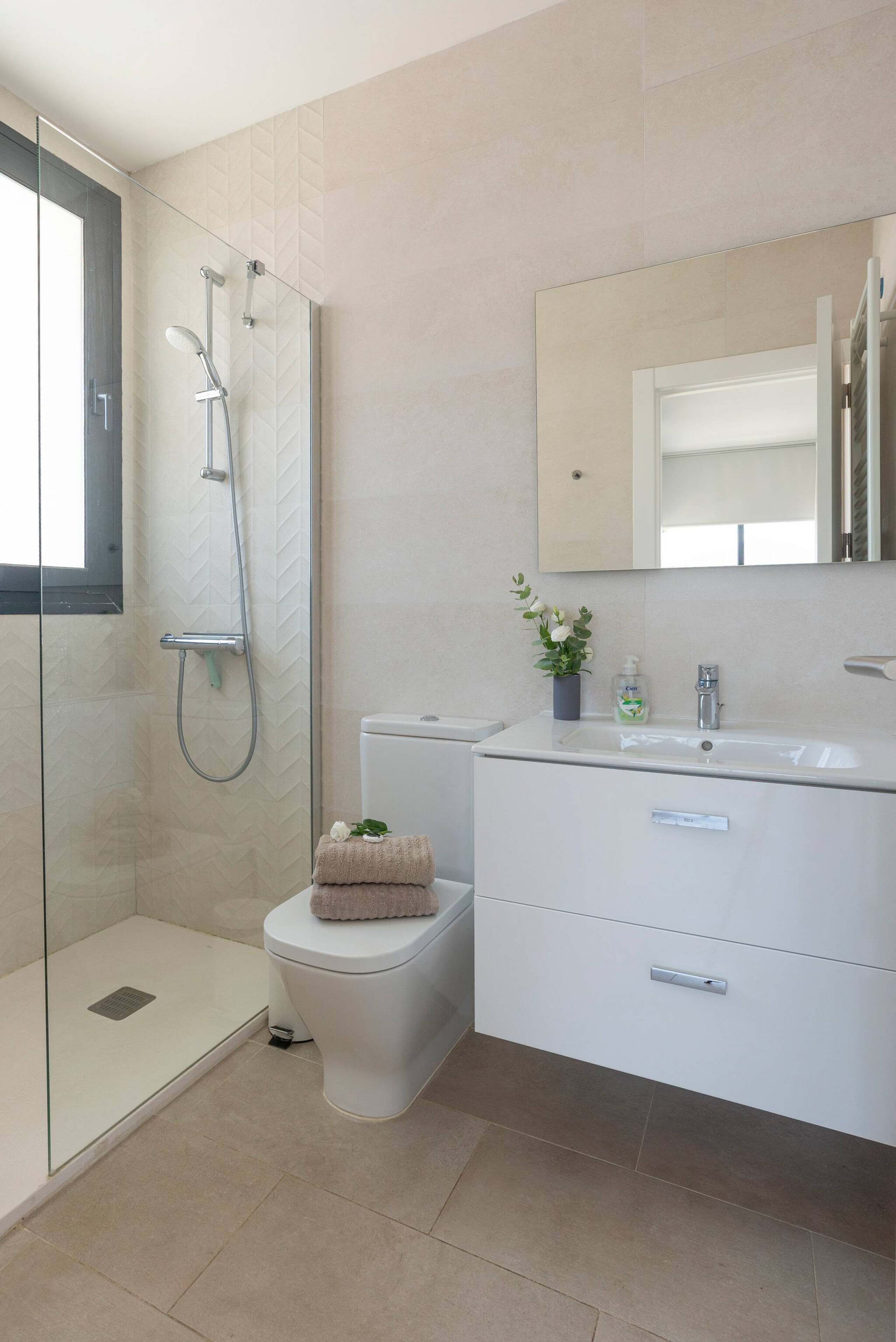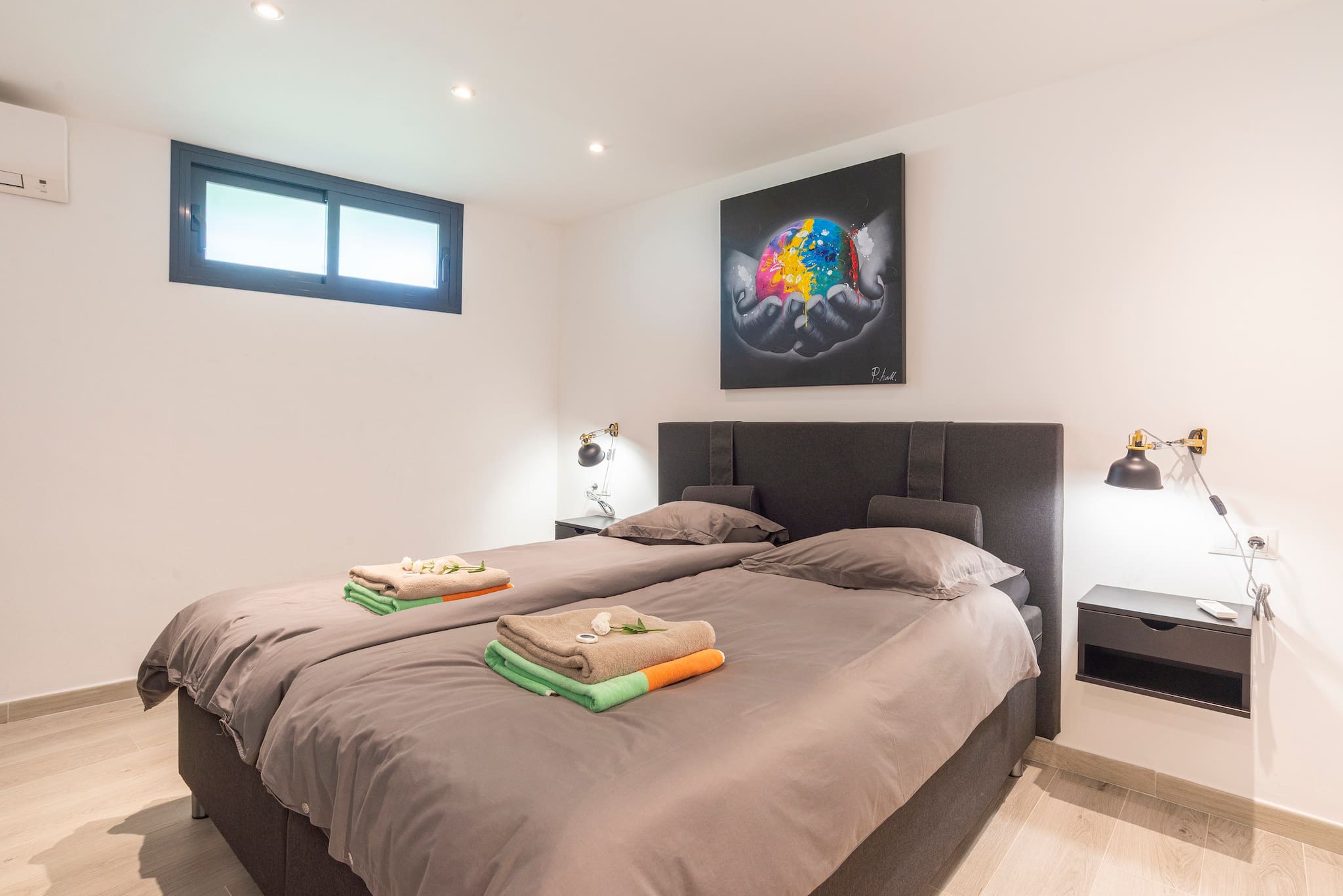1 planta consta de 3 dormitorios todos con armarios empotrados y 2 baños. 2 de los dormitorios tienen camas queen size y 1 dormitorio tiene 3 camas individuales por lo que pueden ser 7 personas en total. Hay 2 baños, uno con bañera y el otro con ducha.