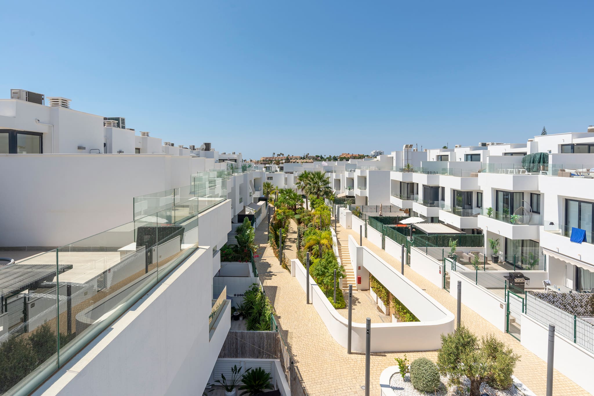 Adosado nuevo a 5 minutos andando de la playa y cerca del pueblo de Fuengirola. Hay 3 dormitorios y 2 baños. Amplio salón con cocina abierta. Fantástica vista al mar Mediterráneo. Piscina comunitaria y piscina infantil, gimnasio y sauna.