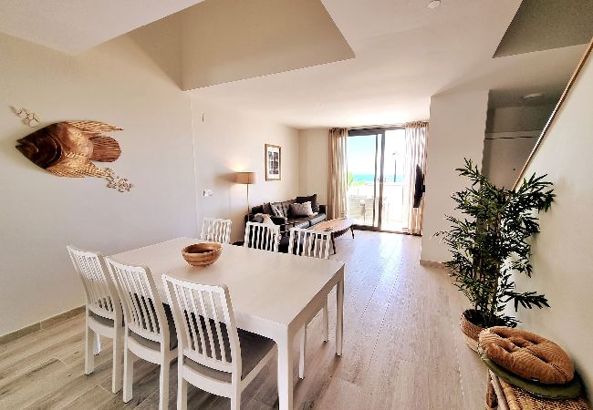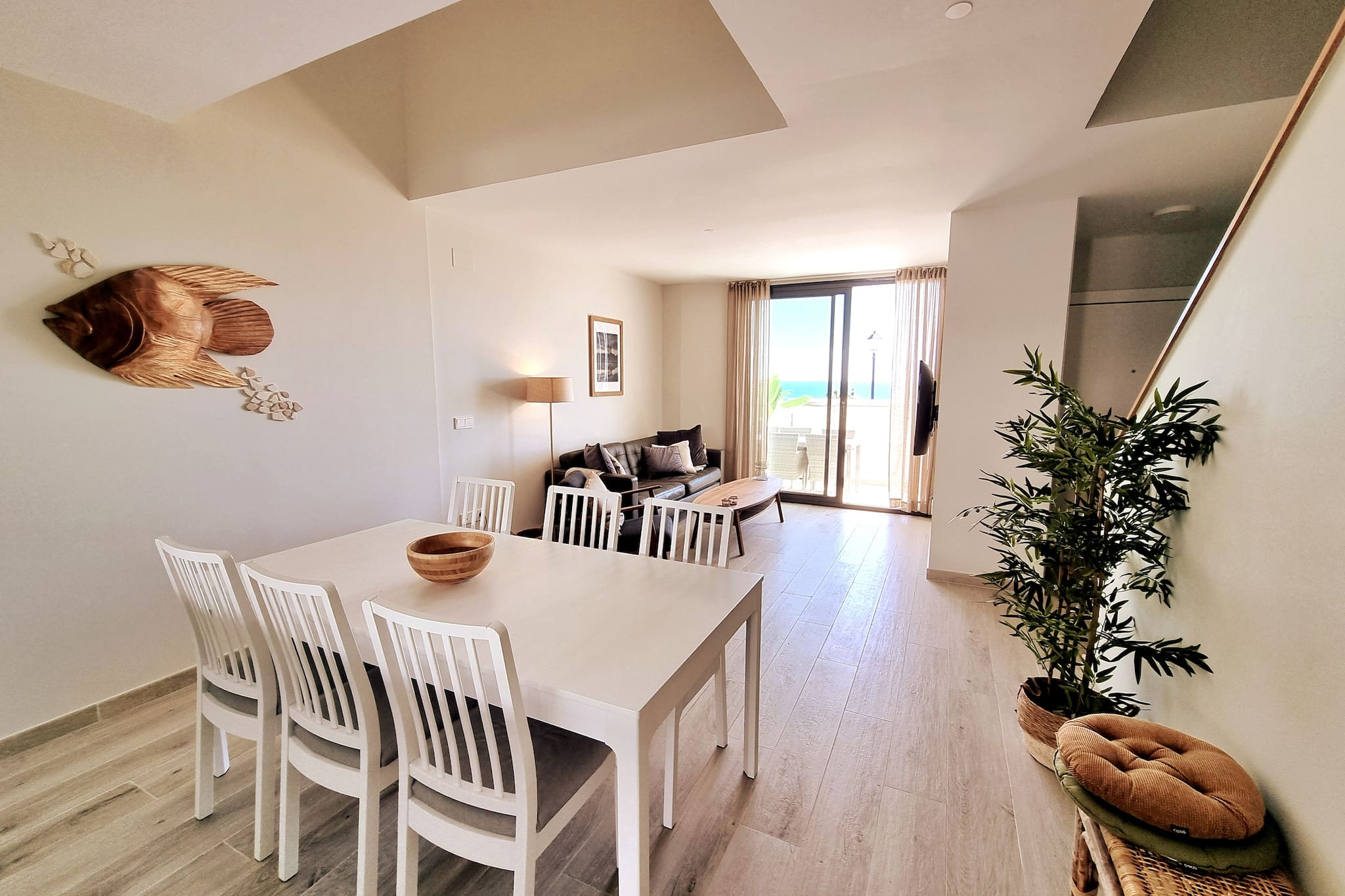 En la planta donde tenemos la entrada, hay un salón comedor con cocina abierta totalmente equipada. En esta planta también tienes un aseo y acceso a otra terraza con zona de comedor, barbacoa y una zona más pequeña con 2 tumbonas.