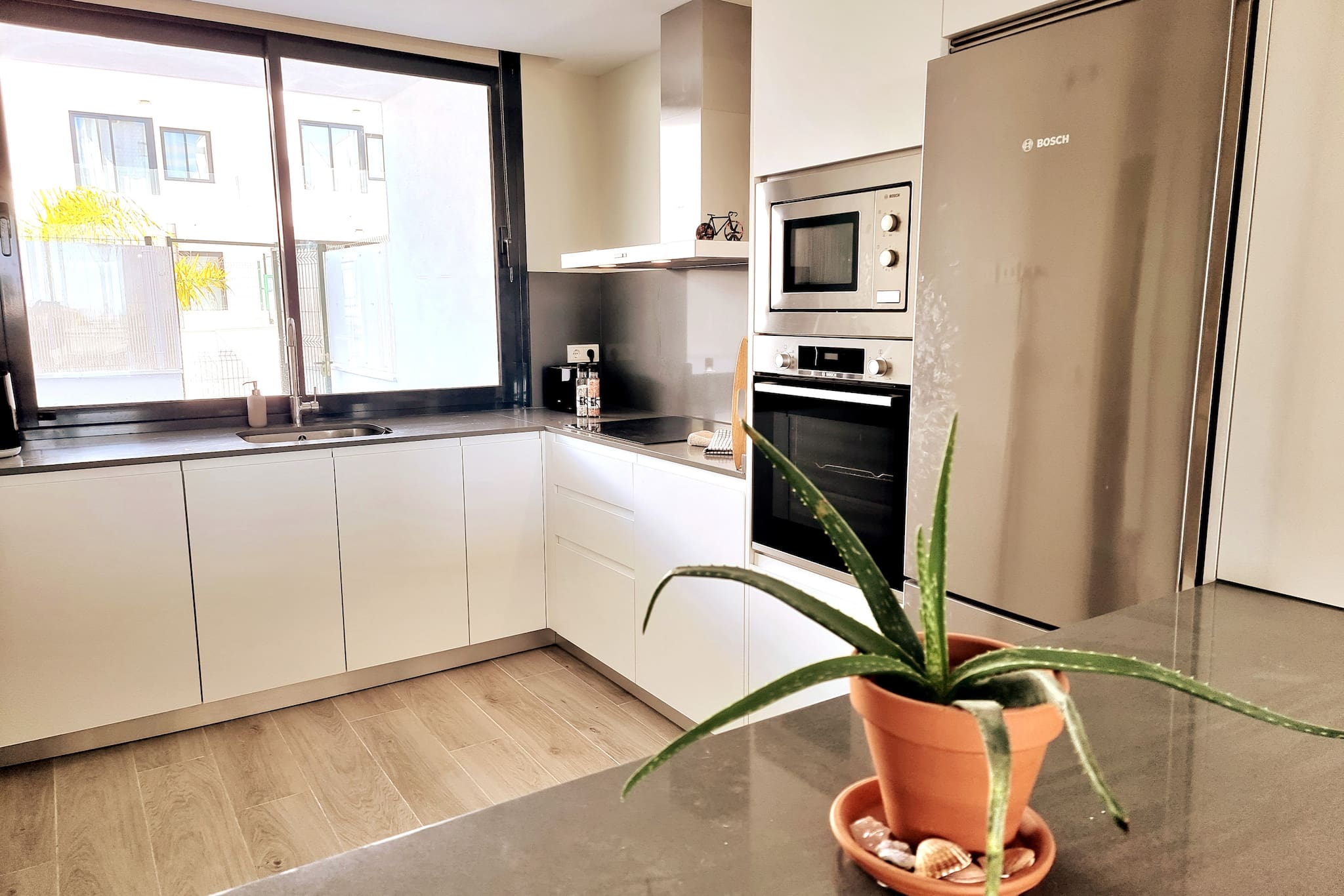 La vivienda ofrece un amplio y luminoso salón con cocina abierta totalmente equipada y acceso directo a una terraza. En esta planta también encontrarás un aseo y un lavadero con lavadora.