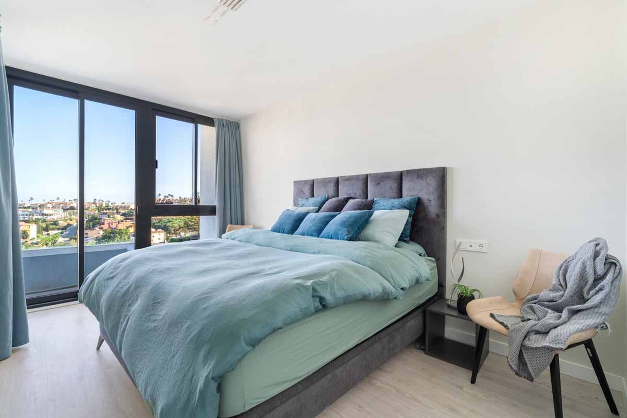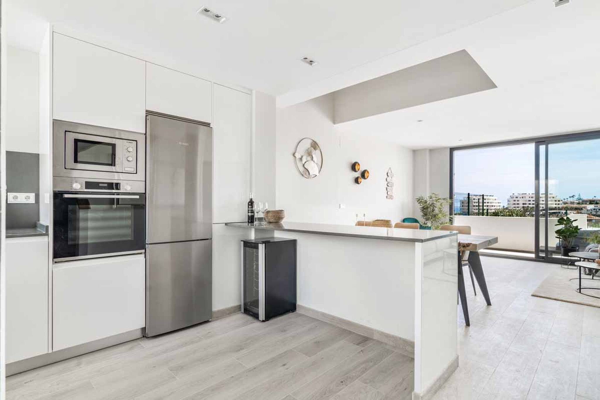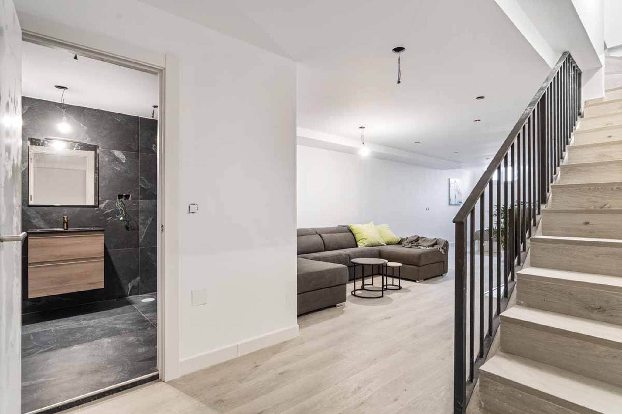 Hermosa sala de estar escandinava con comedor, cocina totalmente equipada. Salida a la terraza desde el salón con vistas al Mar Mediterráneo ya las magníficas puestas de sol. En el primer piso hay 3 dormitorios y 2 baños y si vas más arriba tienes una gran terraza privada en la azotea con vistas aún mejores. En la terraza de la azotea también tiene un comedor, muebles de salón y algunas tumbonas.