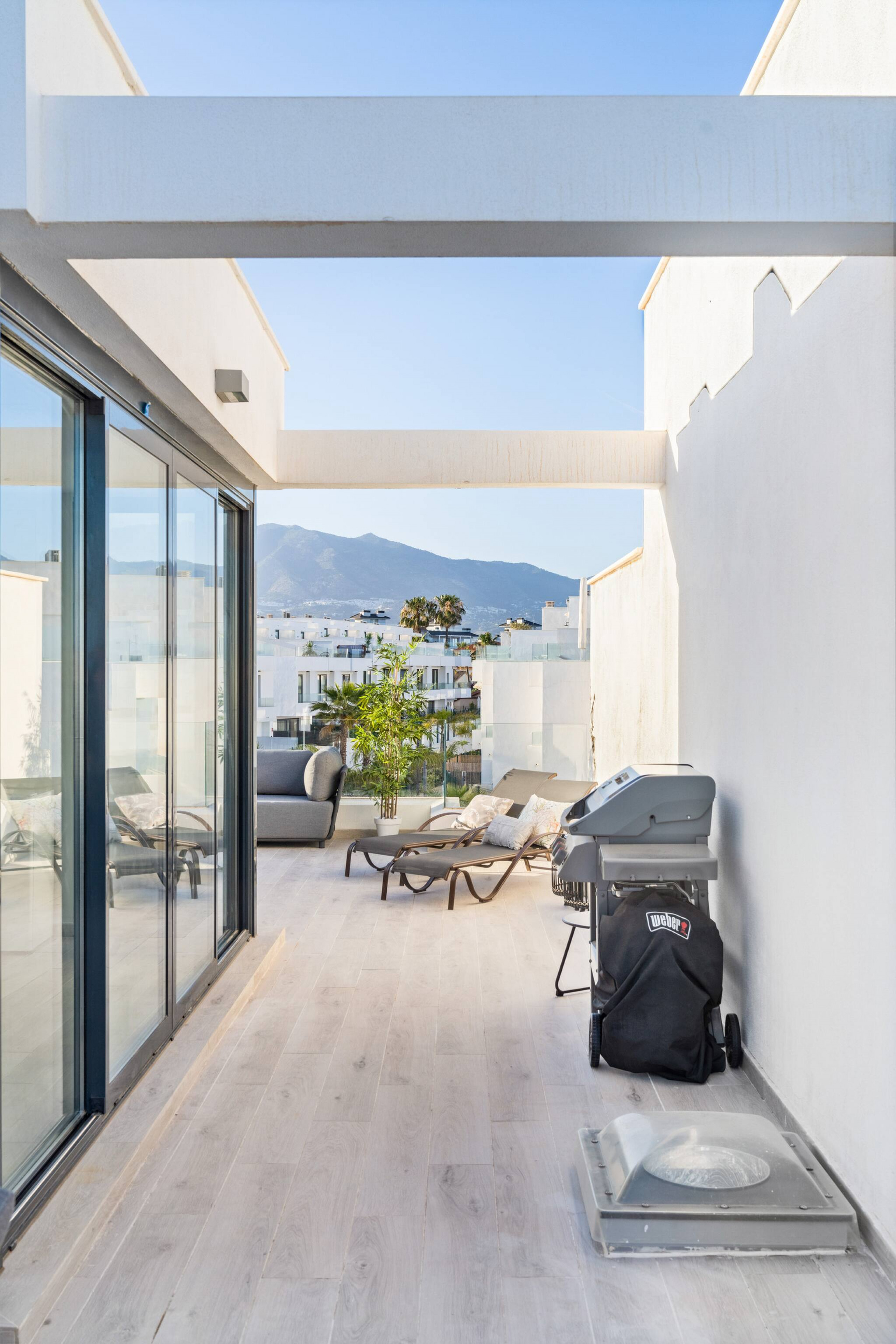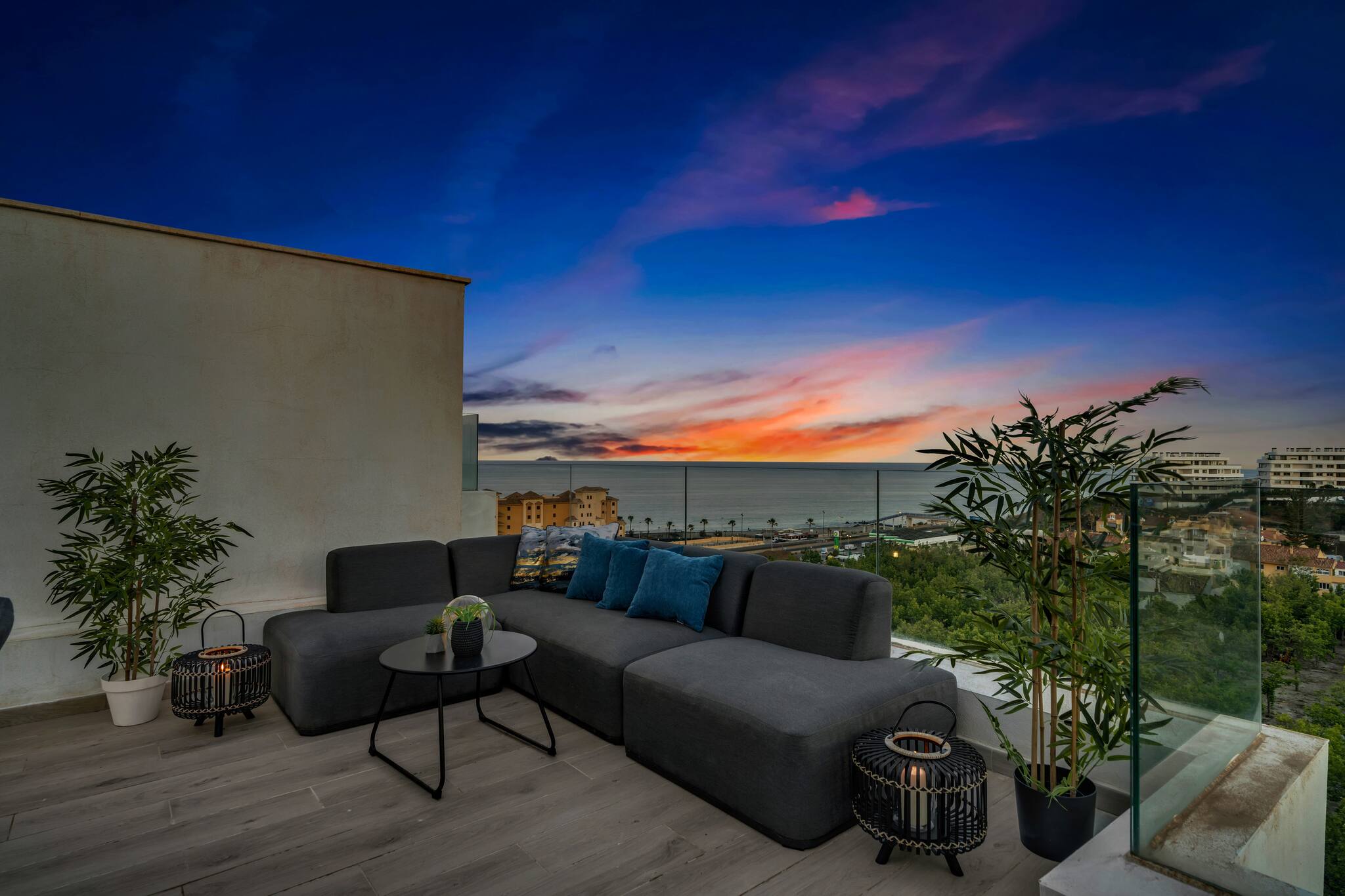 Tienes mucho espacio aquí. Hay una gran terraza privada con vistas al Mediterráneo y una terraza privada en la azotea con muebles de salón y tumbonas.