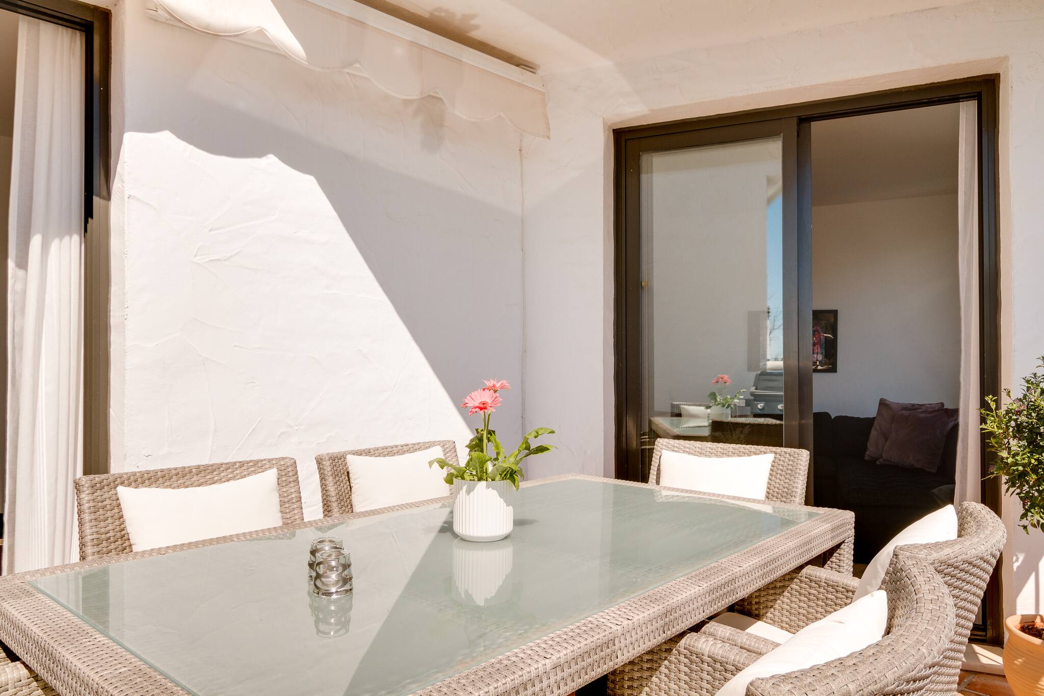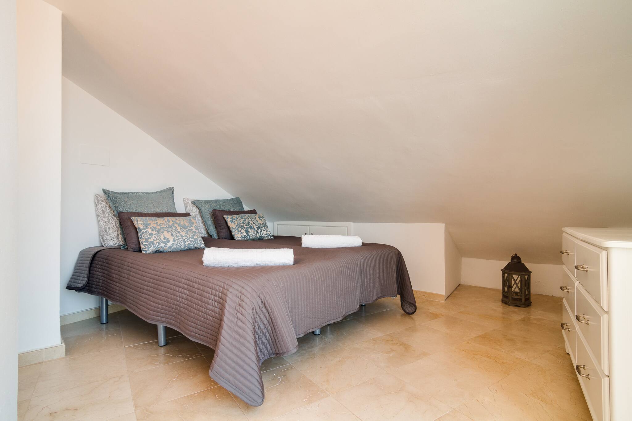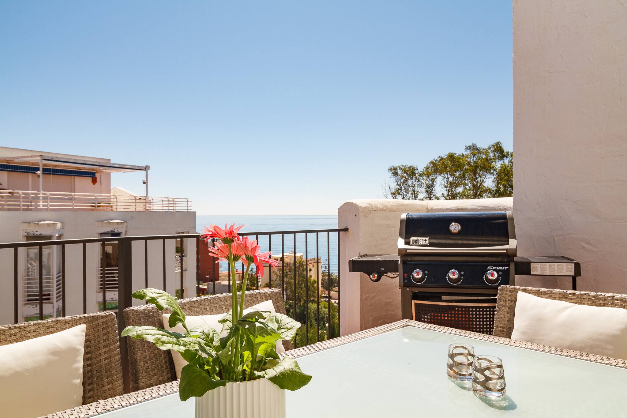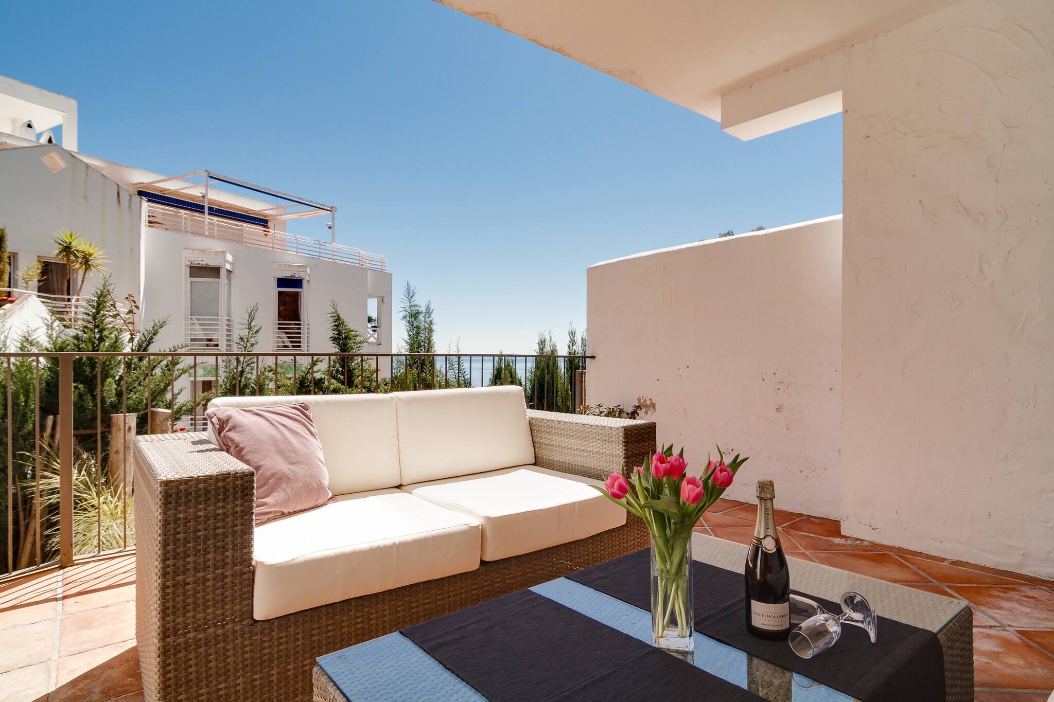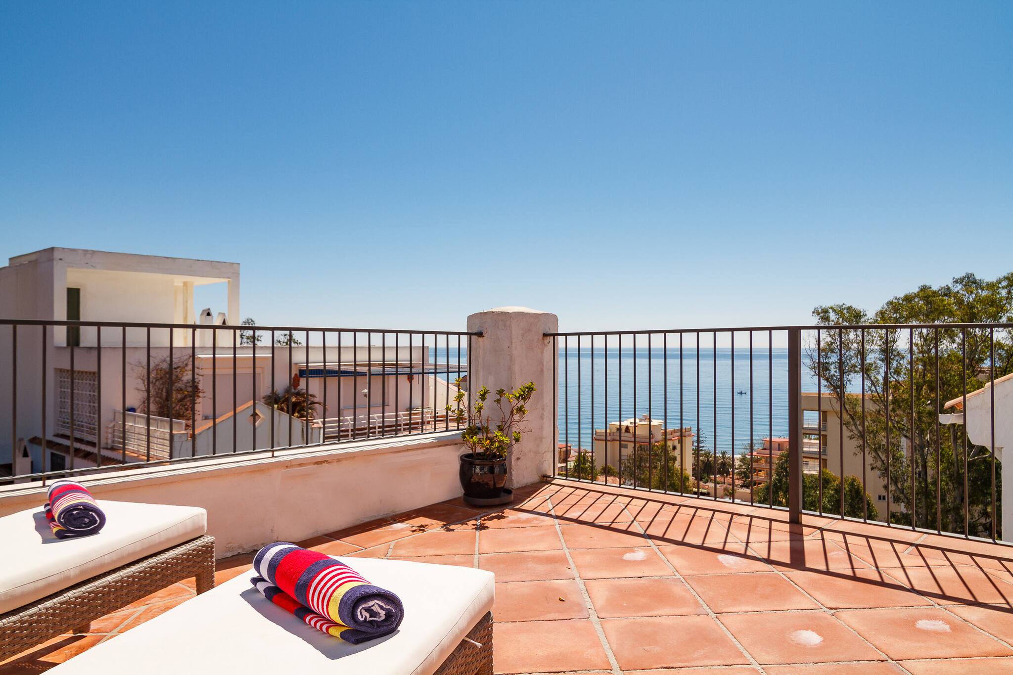 Tienes mucho espacio aquí. Hay una gran terraza privada con vistas al Mediterráneo y una terraza privada en la azotea con muebles de salón y tumbonas.