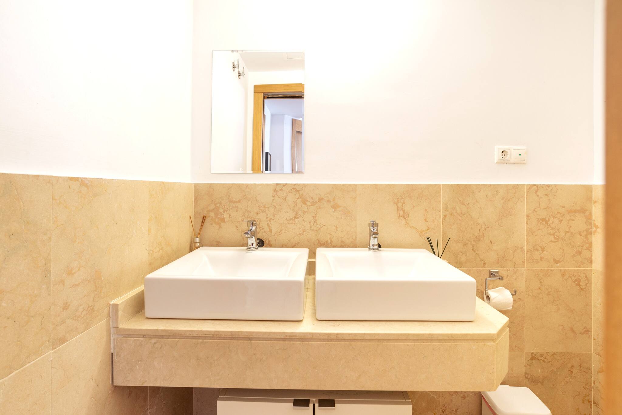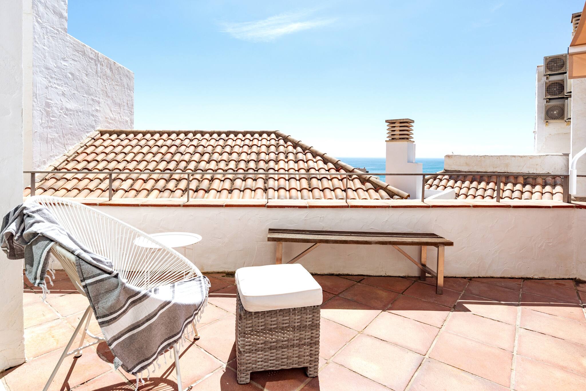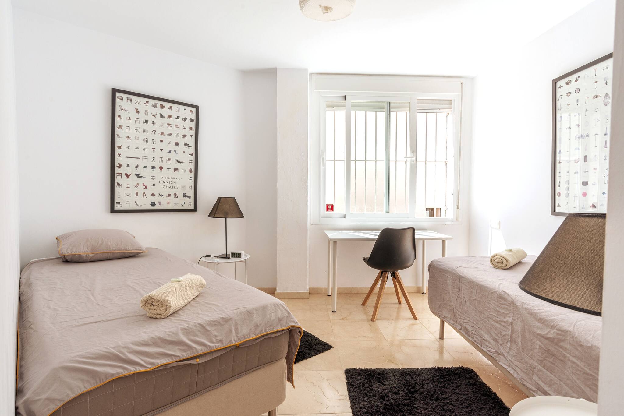 Cuando entras en el pasillo del primer piso, hay un sofá que se puede abrir en una cama. (Esta habitación no se calcula como un dormitorio). Desde aquí hay acceso a la terraza de la azotea con muebles de salón e impresionantes vistas del Mediterráneo y Fuengirola. De vuelta al pasillo, hay una puerta que da al quinto dormitorio. Aquí tienes un sofá cama, aire acondicionado y una playstation. Esta habitación también tiene baño privado. También hay un baño más pequeño en este piso.