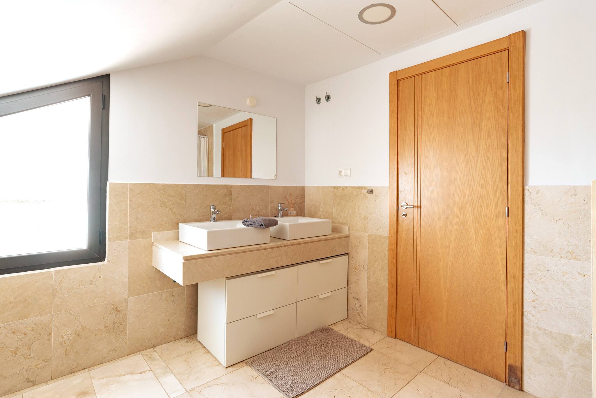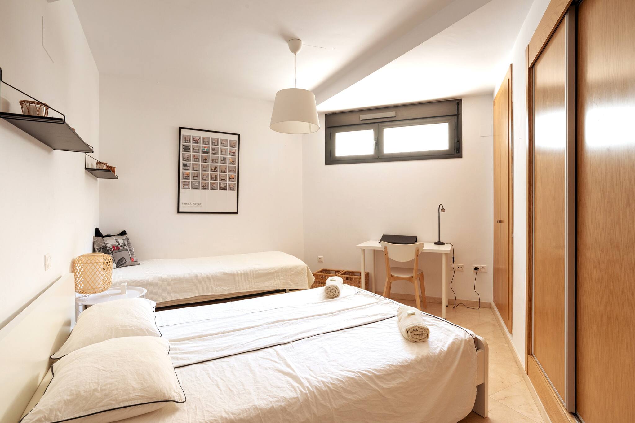 En la planta baja hay 4 dormitorios, todos con baños en suite. 1 dormitorio tiene una cama doble y una cama individual. El dormitorio 2 tiene 2 camas individuales. El dormitorio 3 tiene 2 camas individuales. El dormitorio 4 tiene una cama 3/4 (doble) y una cama individual. Todas las habitaciones tienen aire acondicionado, tanto aire frío como caliente. En esta planta también hay un lavadero más pequeño con lavadora y secadora. Hay un montón de armarios empotrados.