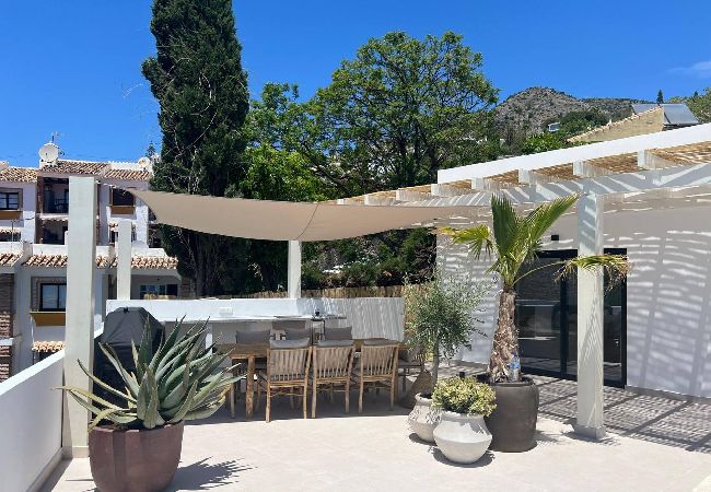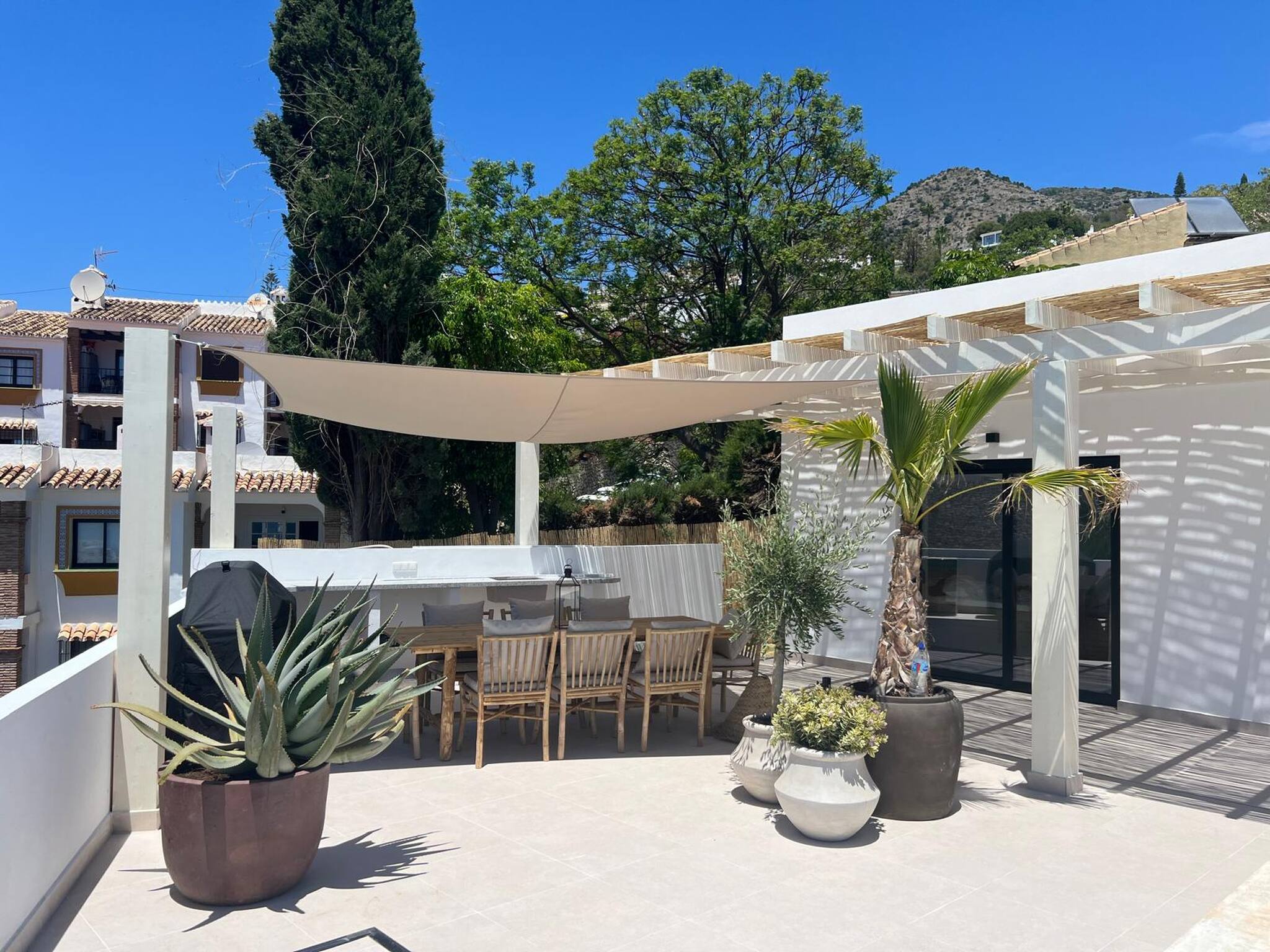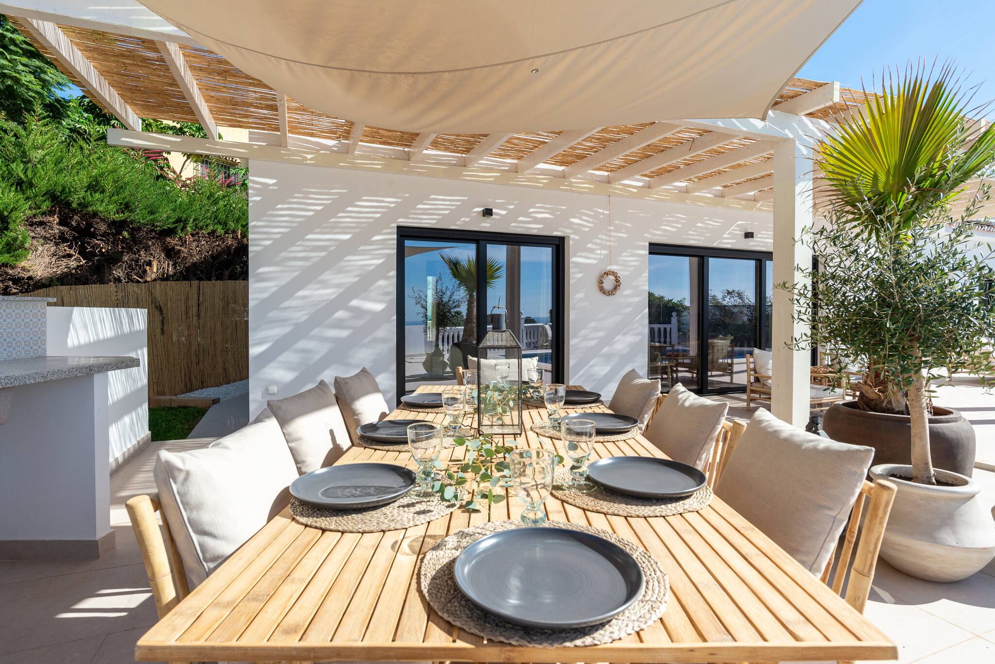 Cocina exterior con parrilla a gas y refrigerador. Muebles de salón y tumbonas, la terraza se extiende alrededor de la propiedad y ofrece muchos lugares para relajarse, disfrutar de un café o simplemente relajarse. Además de una fantástica vista del Mediterráneo.