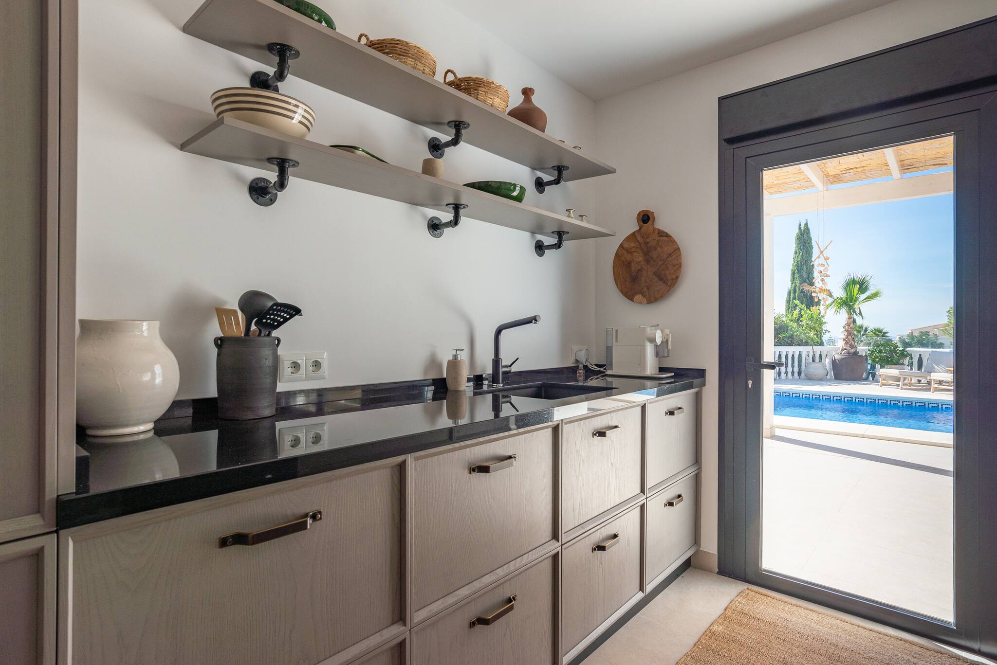 Piscina privada de agua salada que se puede calentar en invierno. Cocina al aire libre con parrilla de gas y refrigerador. Muebles de salón y tumbonas. La terraza rodea toda la propiedad y tiene muchos lugares acogedores donde puede sentarse y relajarse, o simplemente disfrutar de la fantástica vista del Mediterráneo.