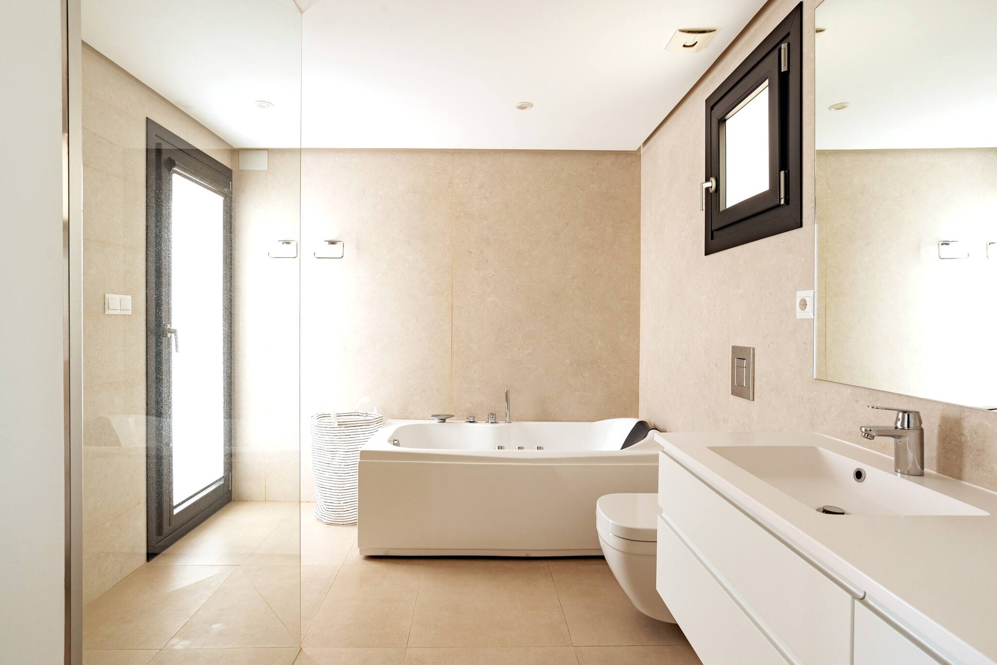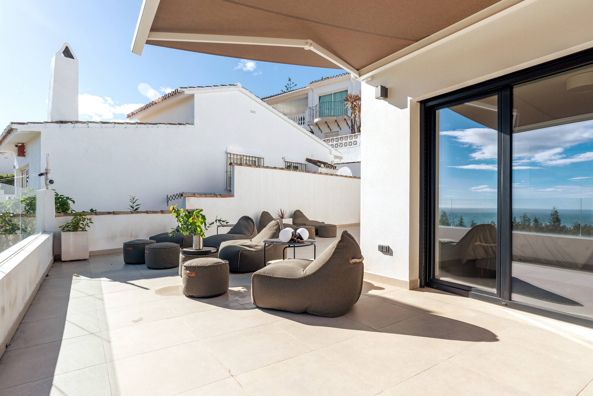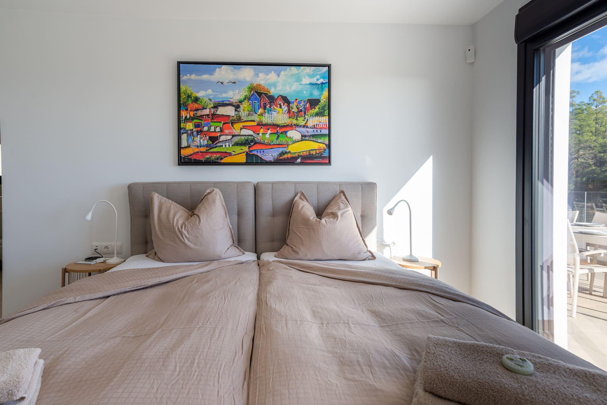 En la planta superior se encuentra la impresionante suite principal, con acceso directo a la terraza y a un solárium privado. Aquí podrás despertarte con vistas al mar y a la montaña, y disfrutar de un gran baño, armarios empotrados y una zona de oficina perfecta si necesitas teletrabajar… o simplemente relajarte con las vistas.