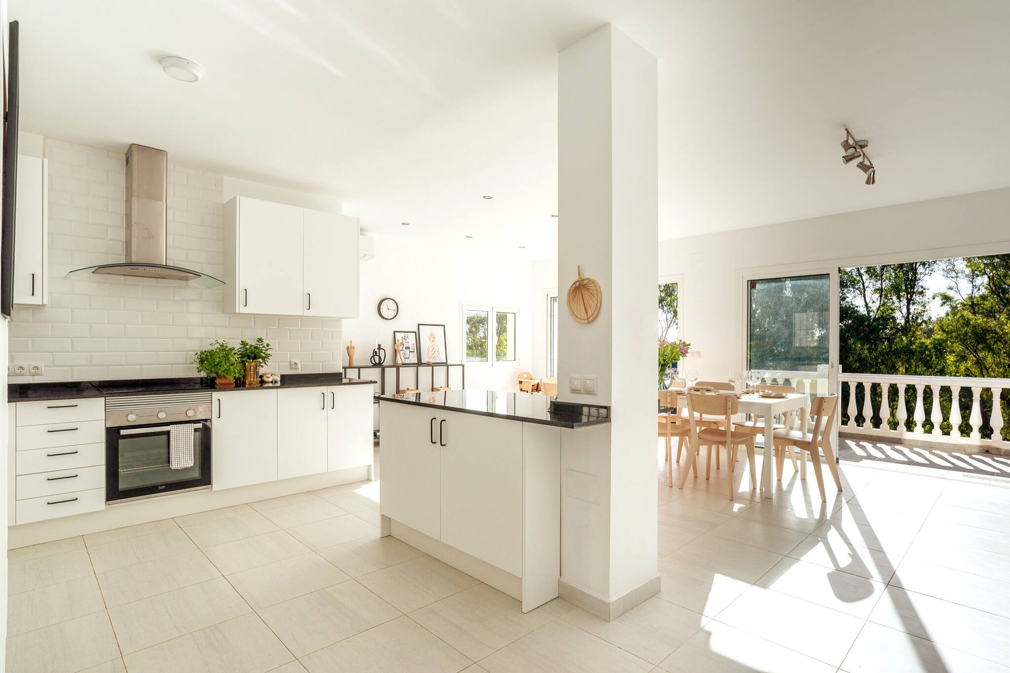 Amplia cocina moderna totalmente equipada de planta abierta con zona de comedor, sala de estar con sofá esquinero y TV. En esta planta también tienes un aseo. Hay acceso a una hermosa terraza grande con muebles de salón, barbacoa y una hermosa vista del mar Mediterráneo. Desde aquí hay escaleras que bajan a la piscina.