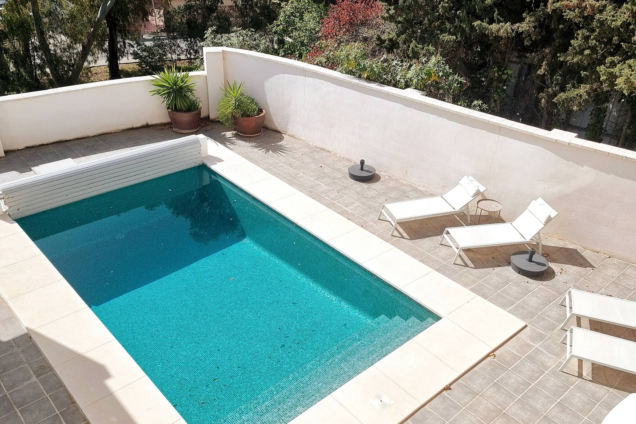Aquí tiene mucho espacio y hay varias terrazas, vistas y una hermosa zona de piscina privada grande con tumbonas.