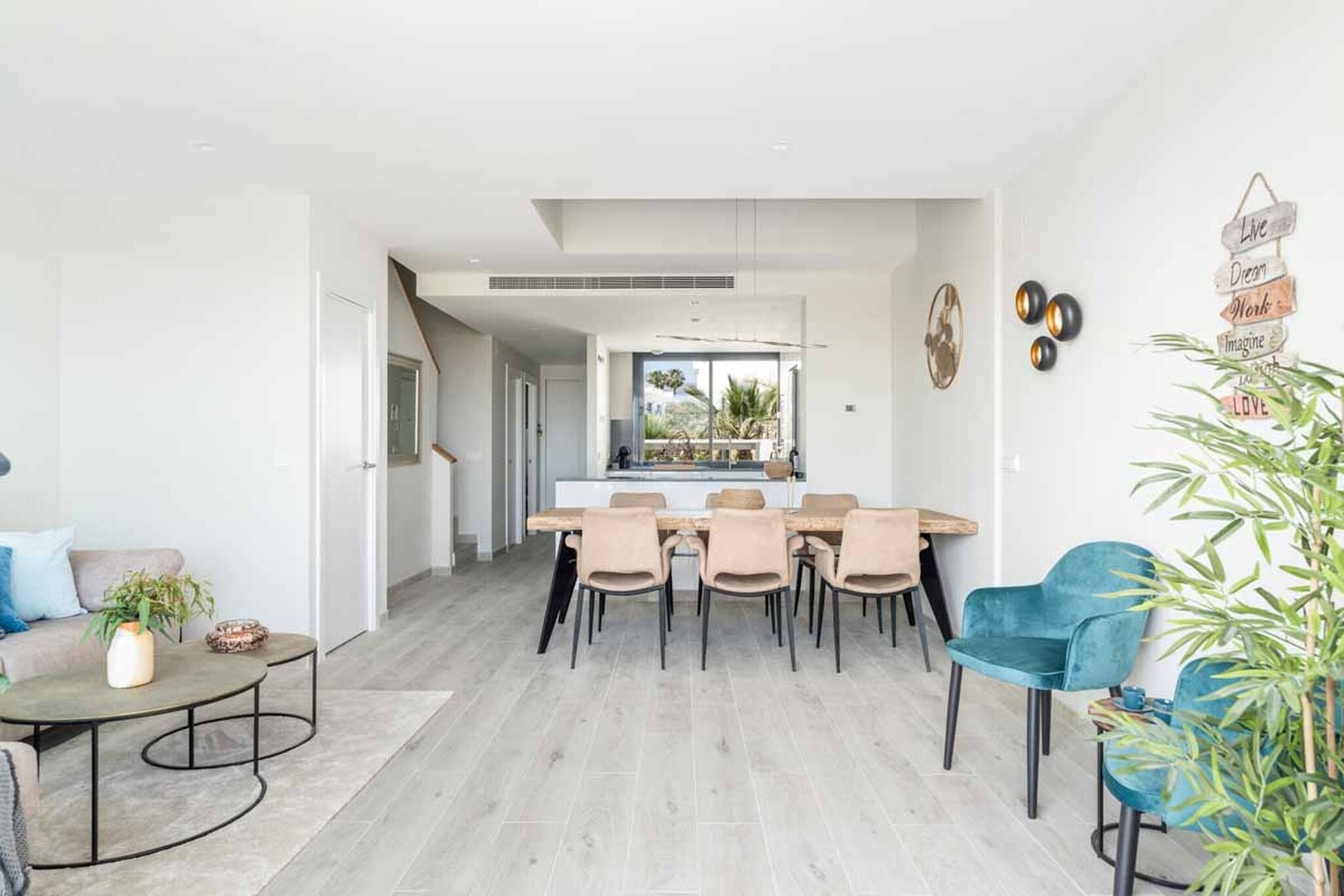 Dejlig skandinavisk stue med spiseplads, fuldt udstyret køkken. Udgang til terrasse fra stuen med udsigt over Middelhavet og de flotte solnedgange. På første sal er der 3 soveværelser og 2 badeværelser og går man længere op har I stor privat tag terrasse med endnu bedre udsigt. På tagterrassen har i også spiseplads, laungemøbler og nogle solsenge.