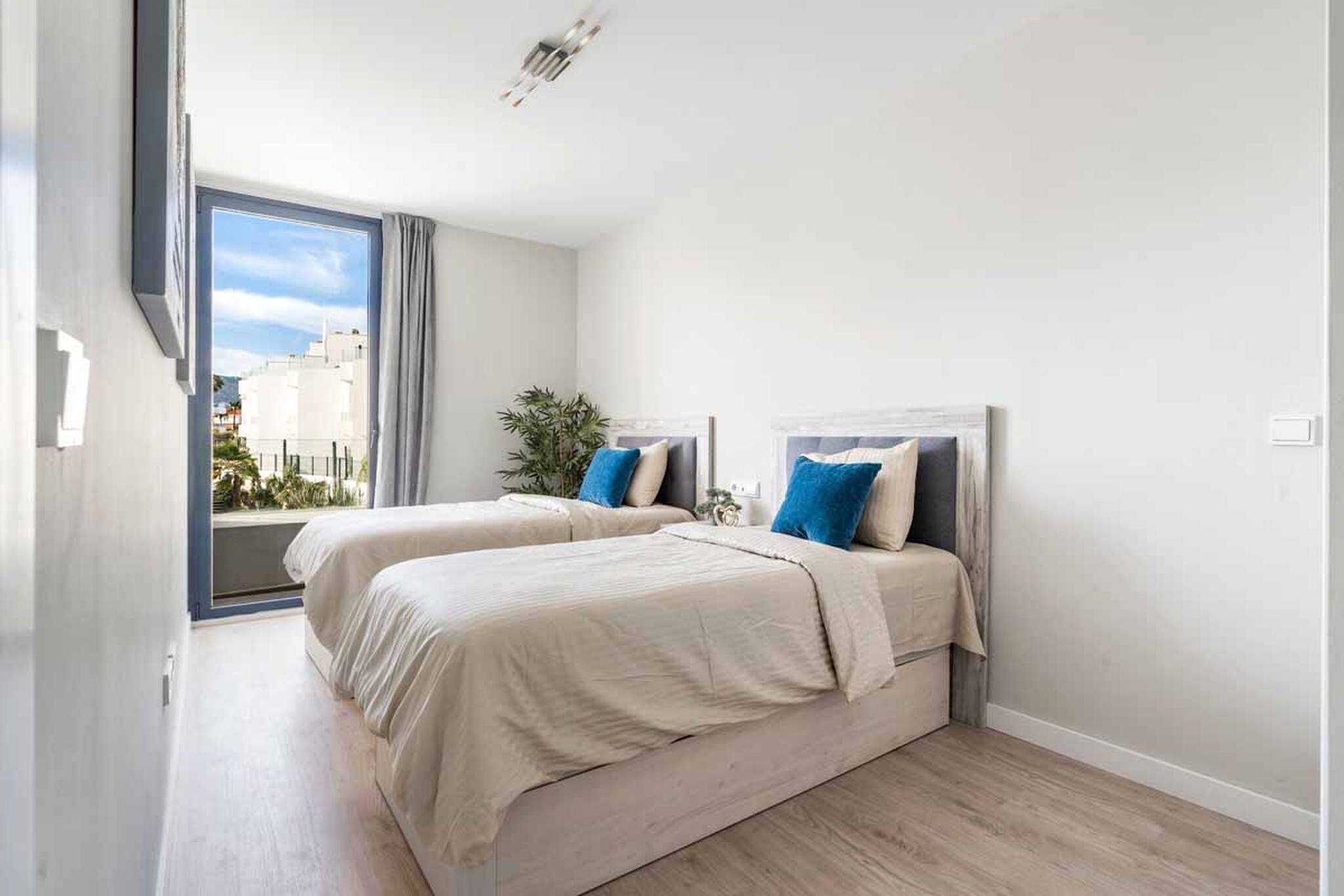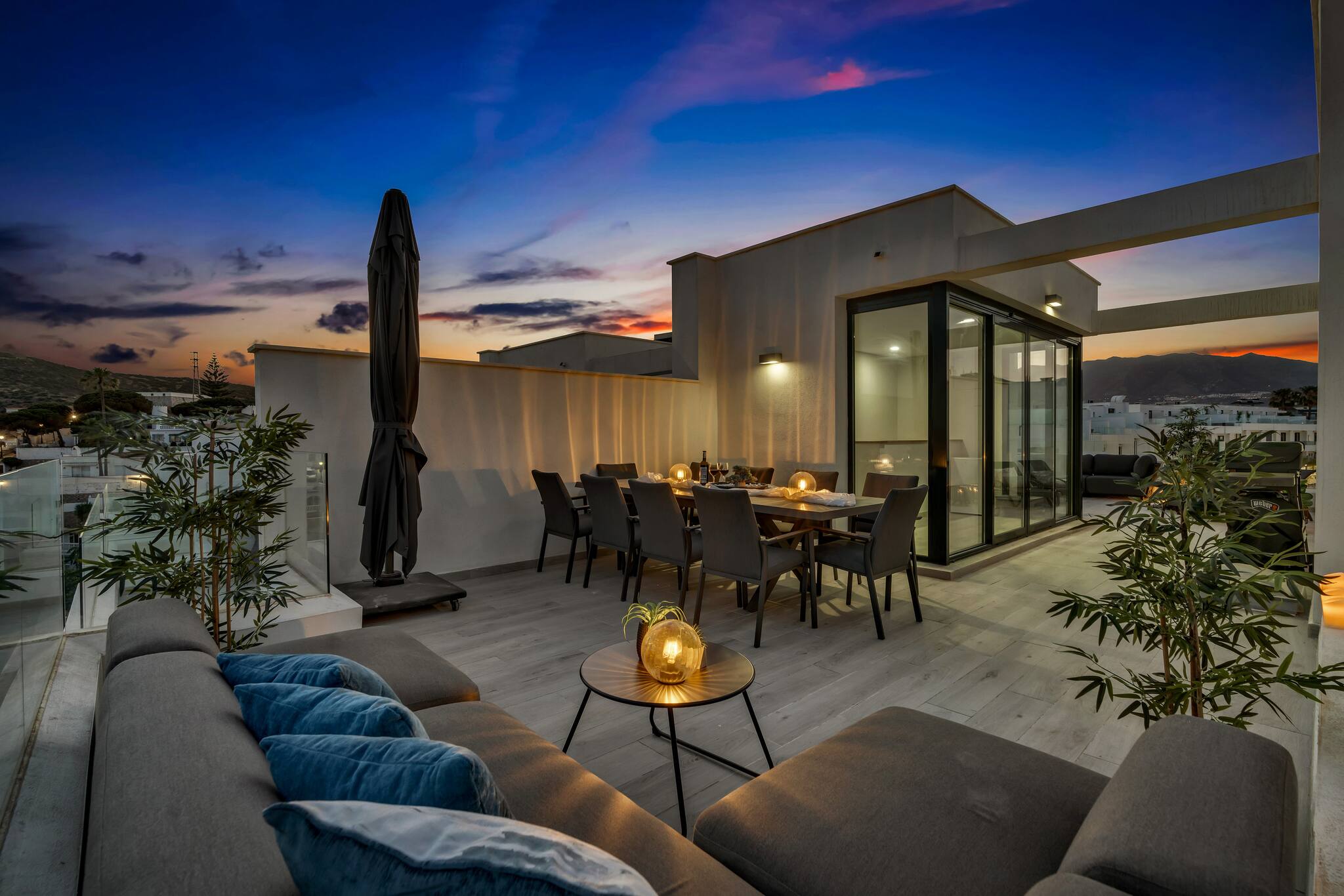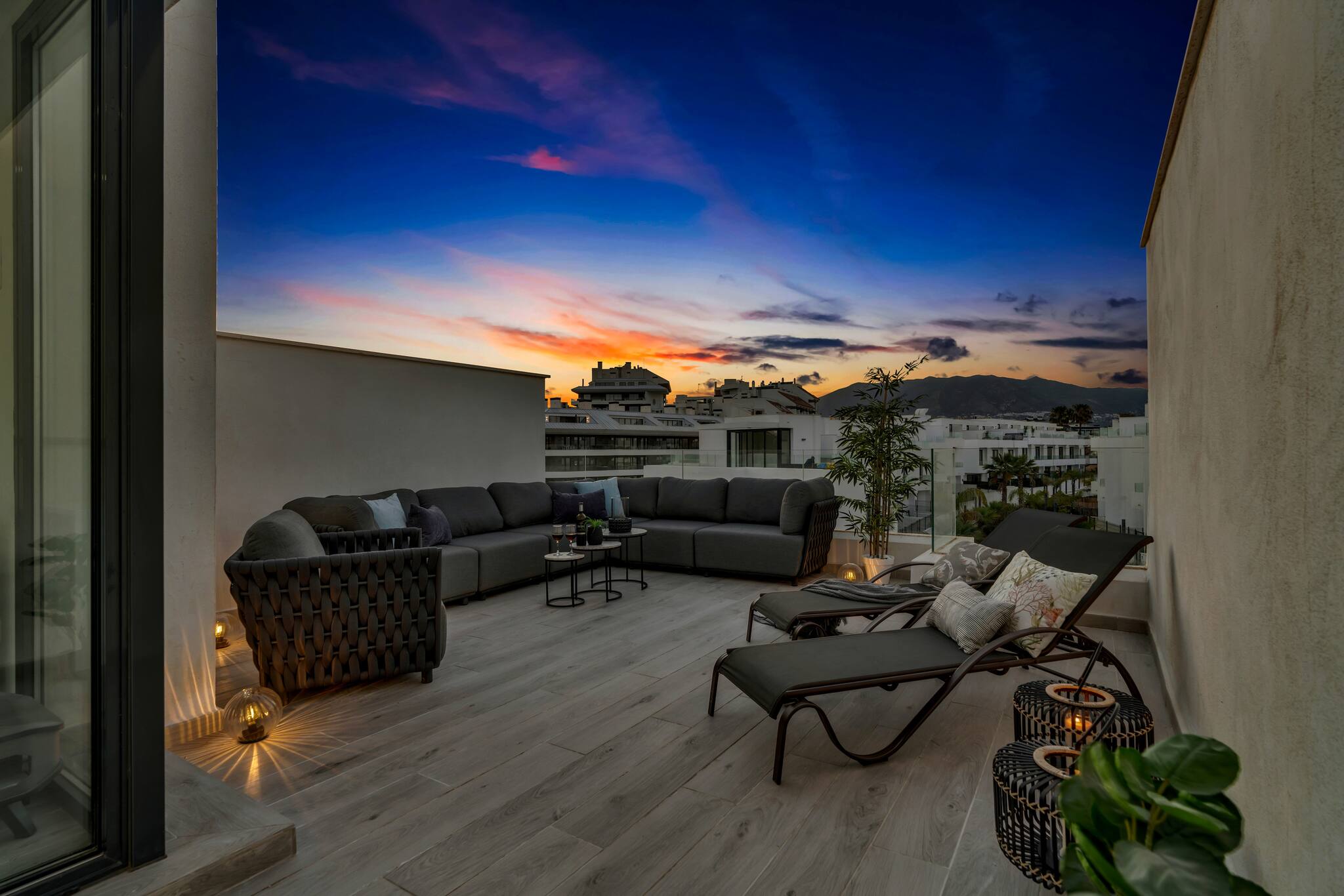 Her har du masser af plads. Her er stor privat terrasse med udsigt over Middelhavet og privat tagterrasse med laungemøbler og solsenge.