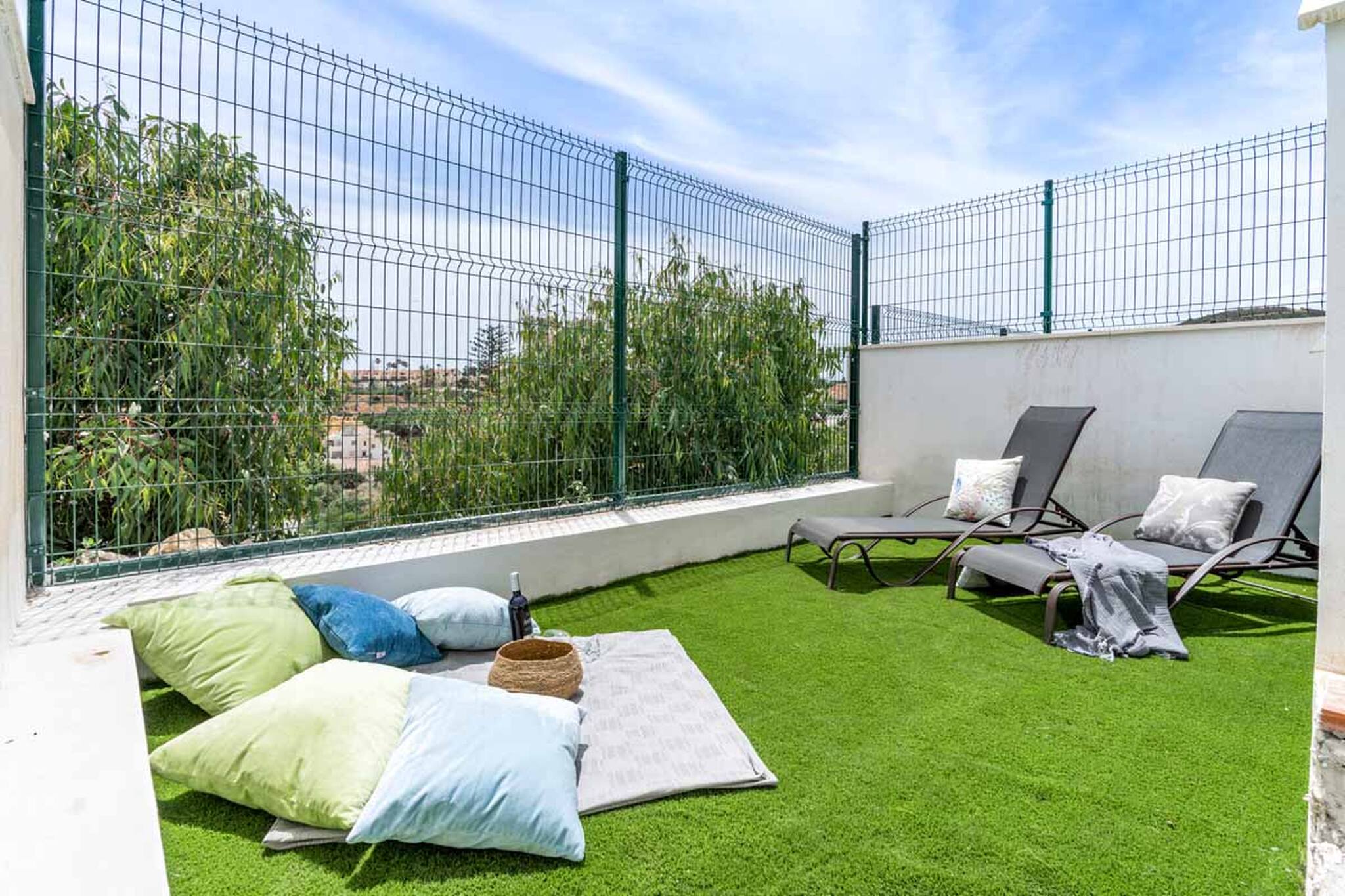 Solarium-terrasse med liggestole, masser af sol til solbadning og nyde udsigten.