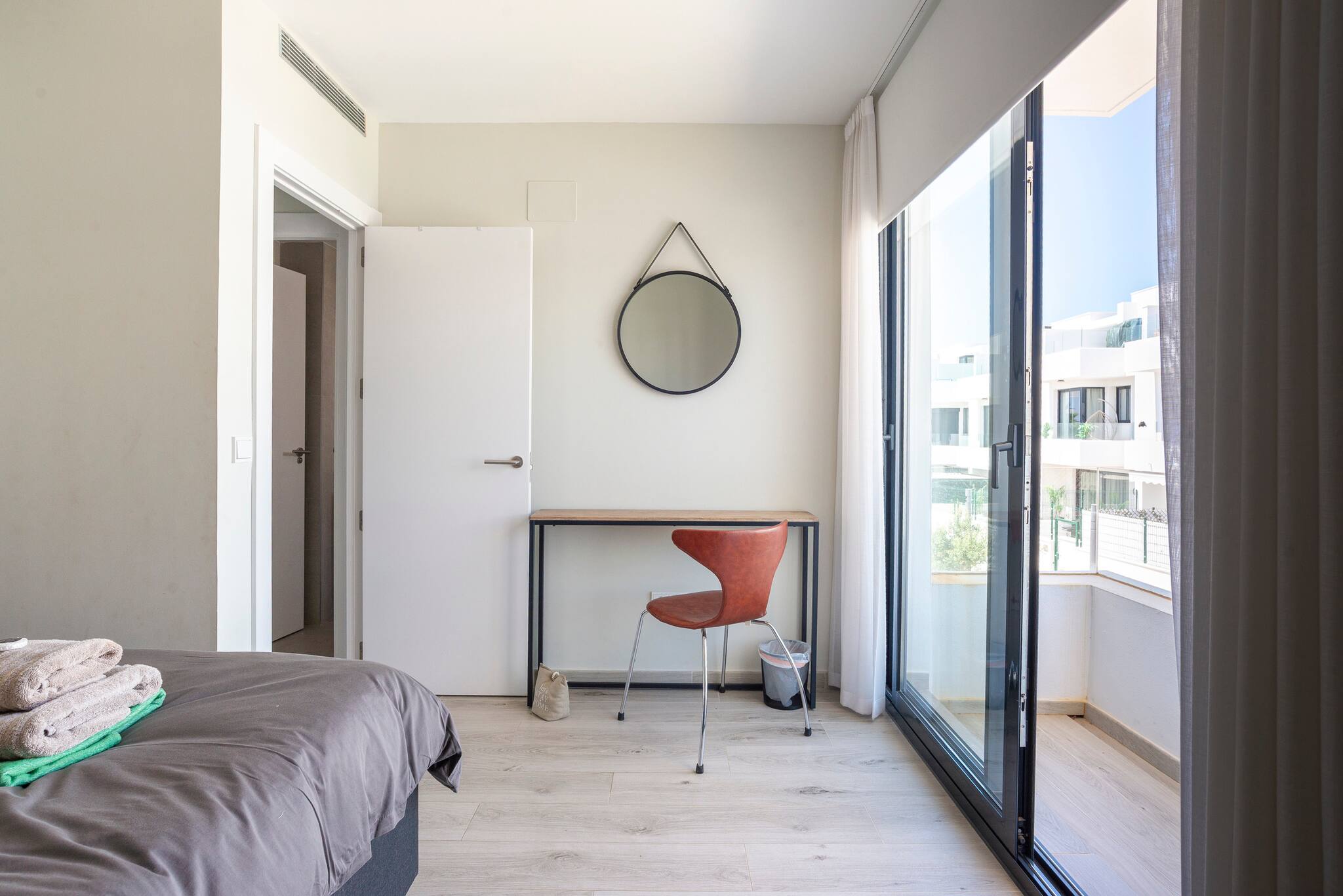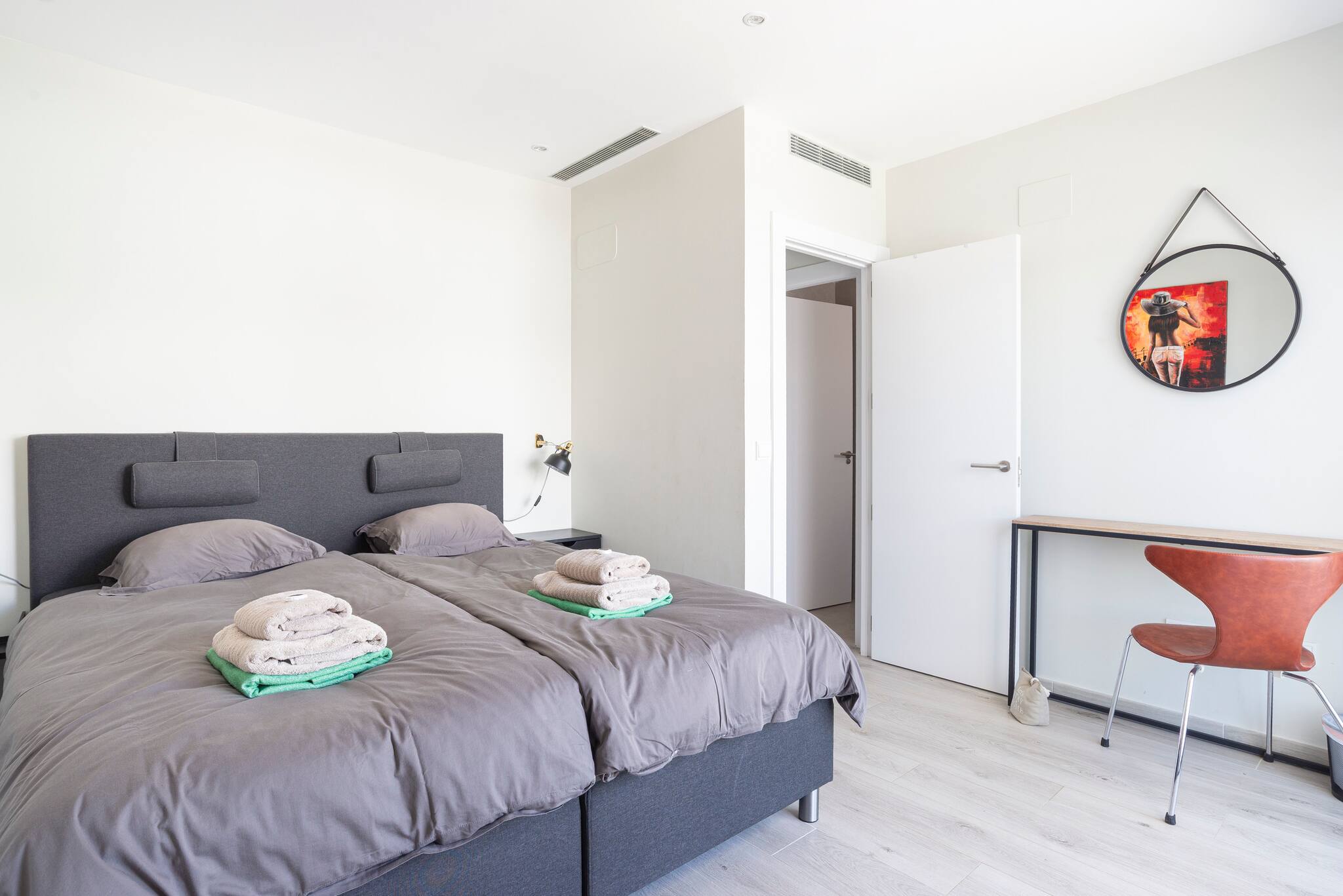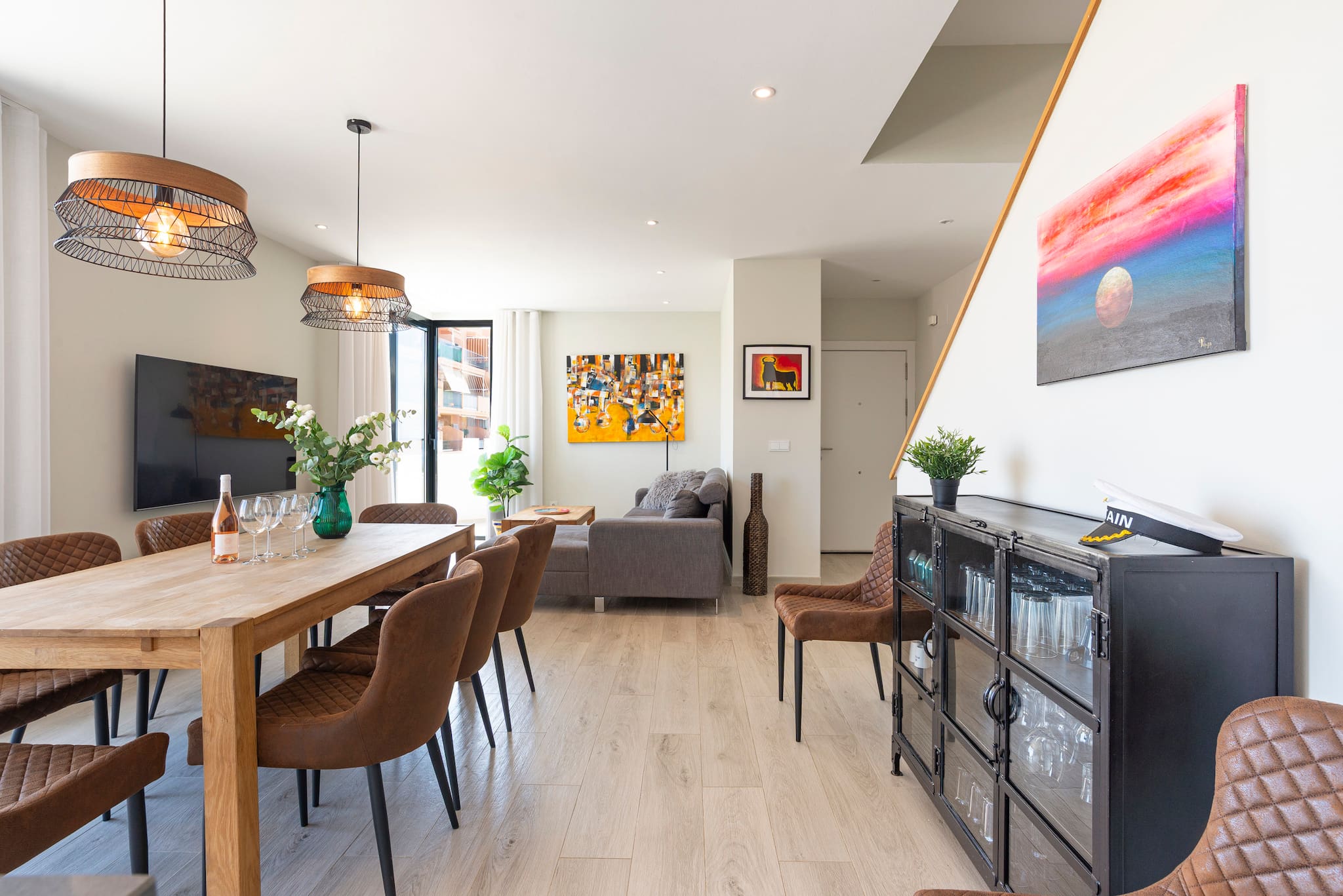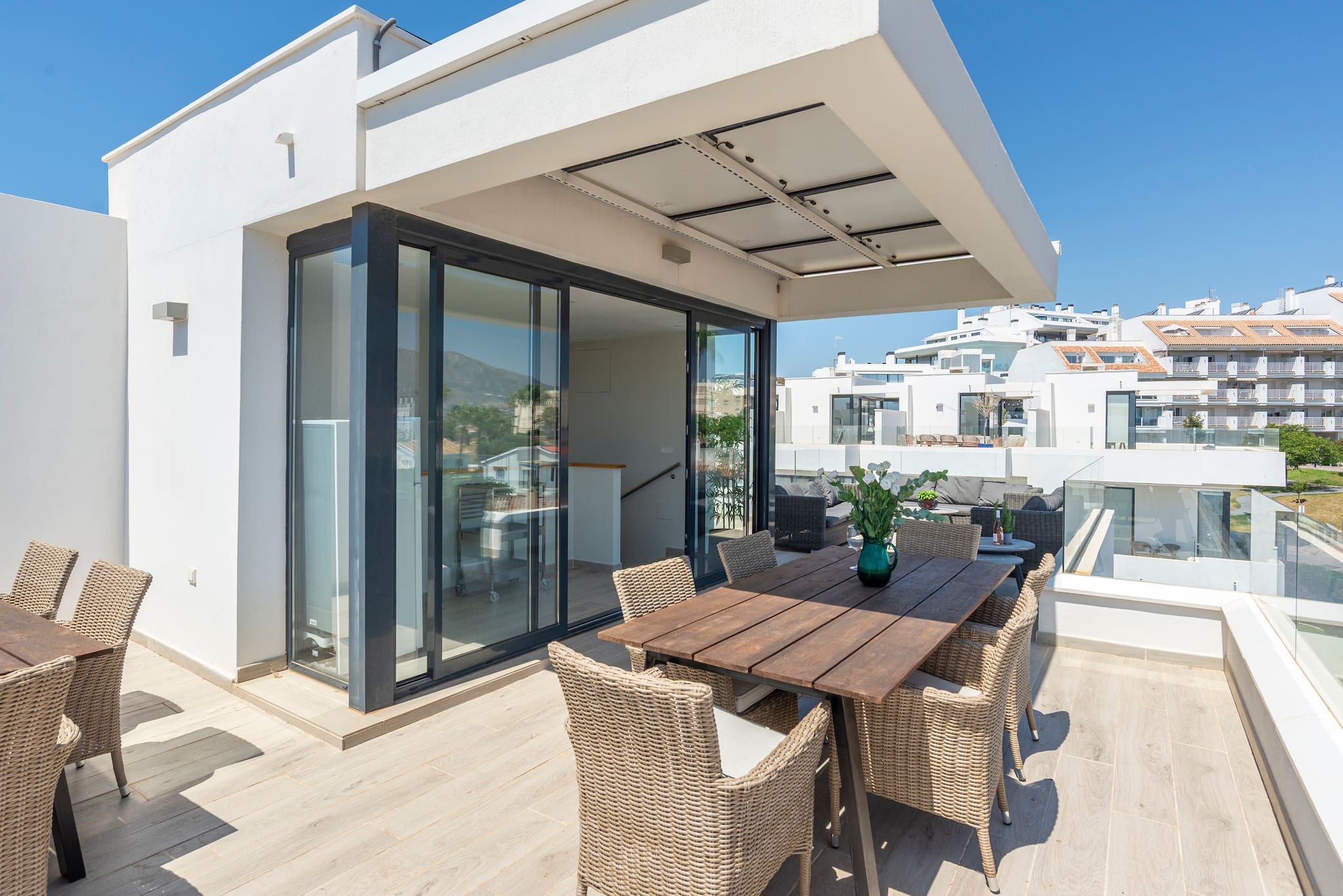 Går du videre op på øverste etage så har du stor privat tagterrasse med spiseplads, laungemøbler, solesenge og BBQ. Her har du en fantastisk udsigt til stranden og bjergene og det vil tage dig 5 minutter at gå til stranden.