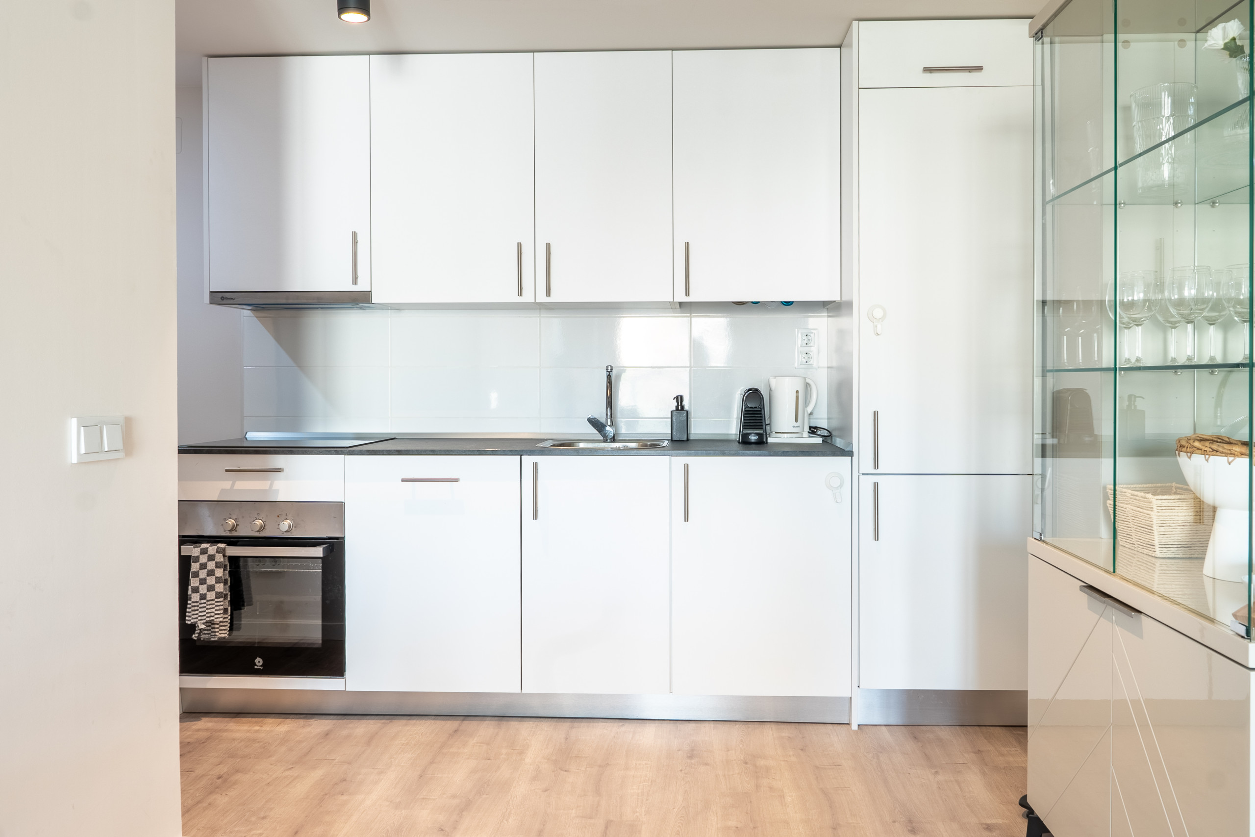 Det amerikanske køkken med keramiske kogeplader, med service og køleskab, mikroovn, ovn, fryser, opvaskemaskine, tallerkener/bestik, køkkenredskaber, kaffemaskine, brødrister og kedel.