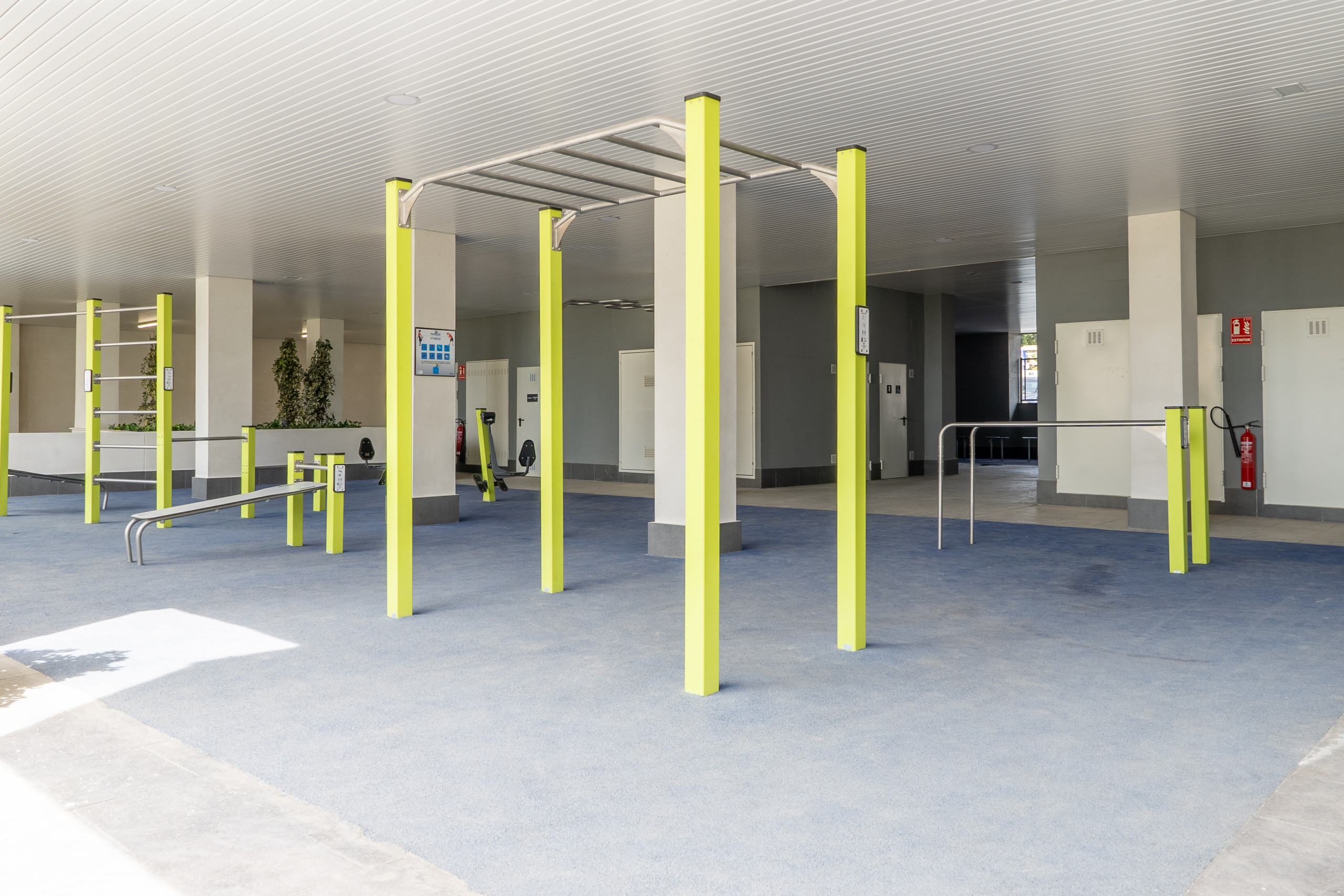 Stor fælles swimmingpool og børnepool. Udendørs træningsudstyr og et mindre legeområde til børn.