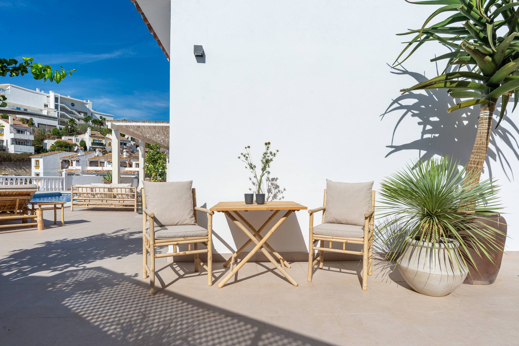 Privat saltvandspool, som kan opvarmes om vinteren. Udendørs køkken med gasgrill og køleskab. Loungemøbler og liggestole. Terrassen går hele vejen rundt om ejendommen og har masser af hyggesteder hvor du kan sidde og slappe af, eller bare nyde den fantastisk udsigt over Middelhavet.