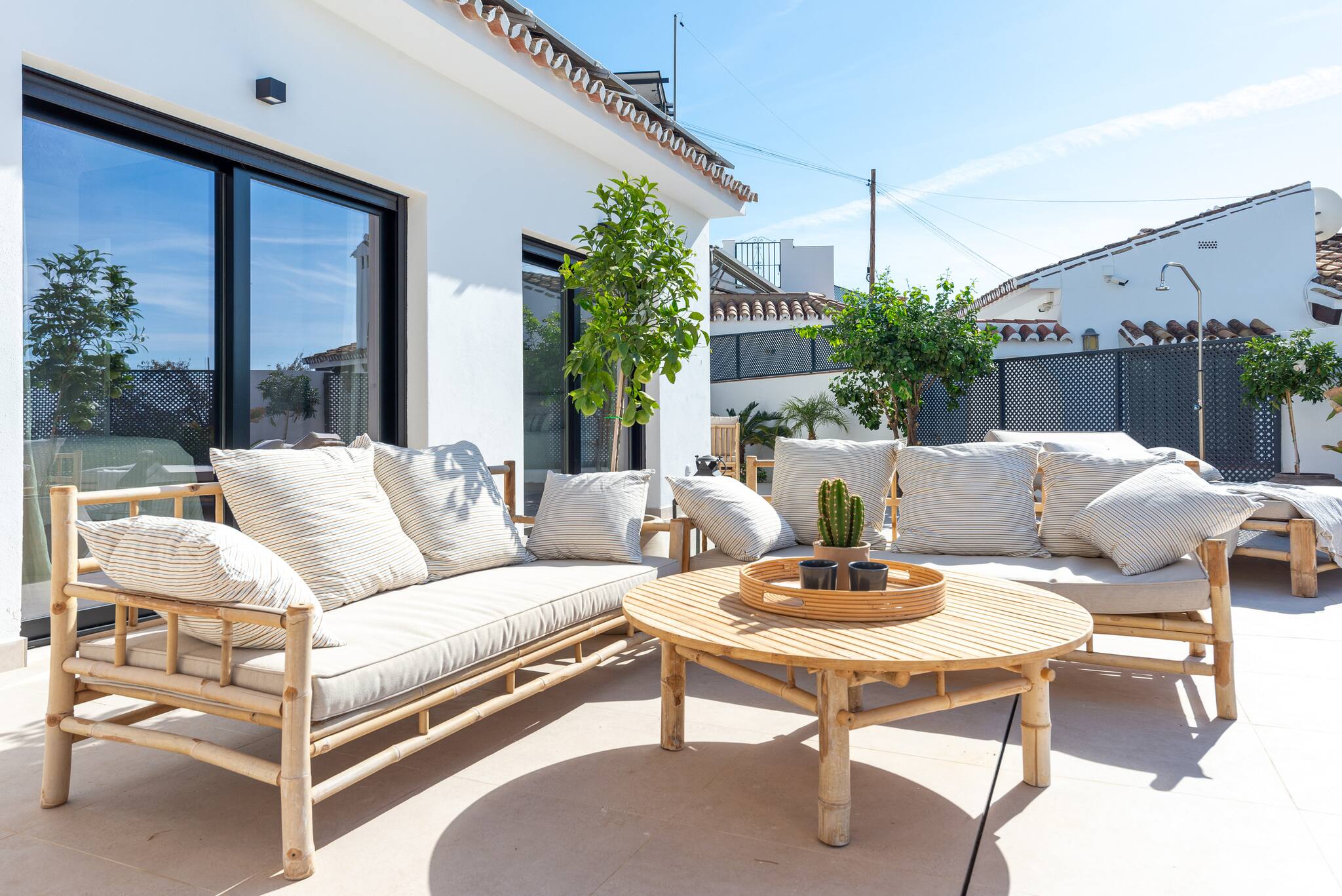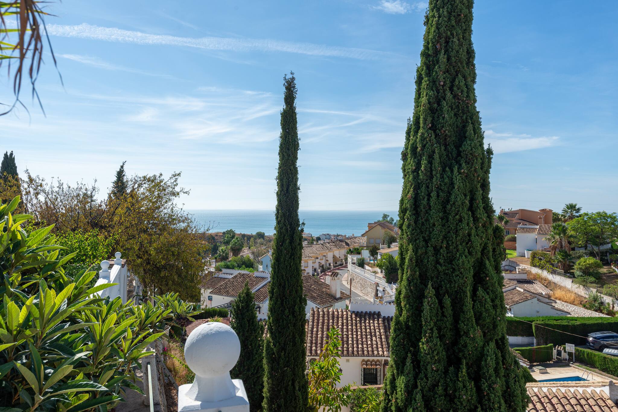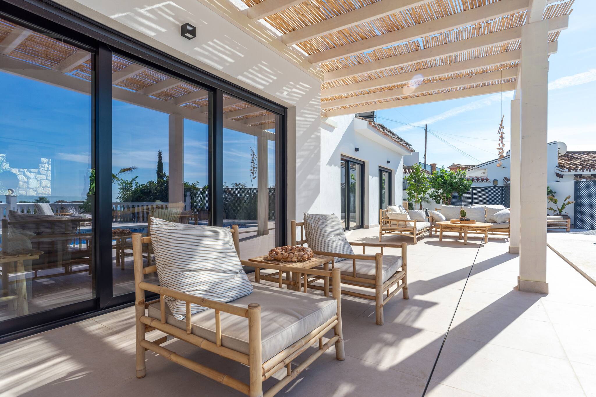 Udendørs køkken med gasgrill og køleskab. Loungemøbler og liggestole, terrassen går hele vejen rundt om ejendommen med masser af steder hvor man kan sidde og hygge, nyde en kaffen eller bare slappe af. Samt en fantastisk udsigt over Middelhavet.