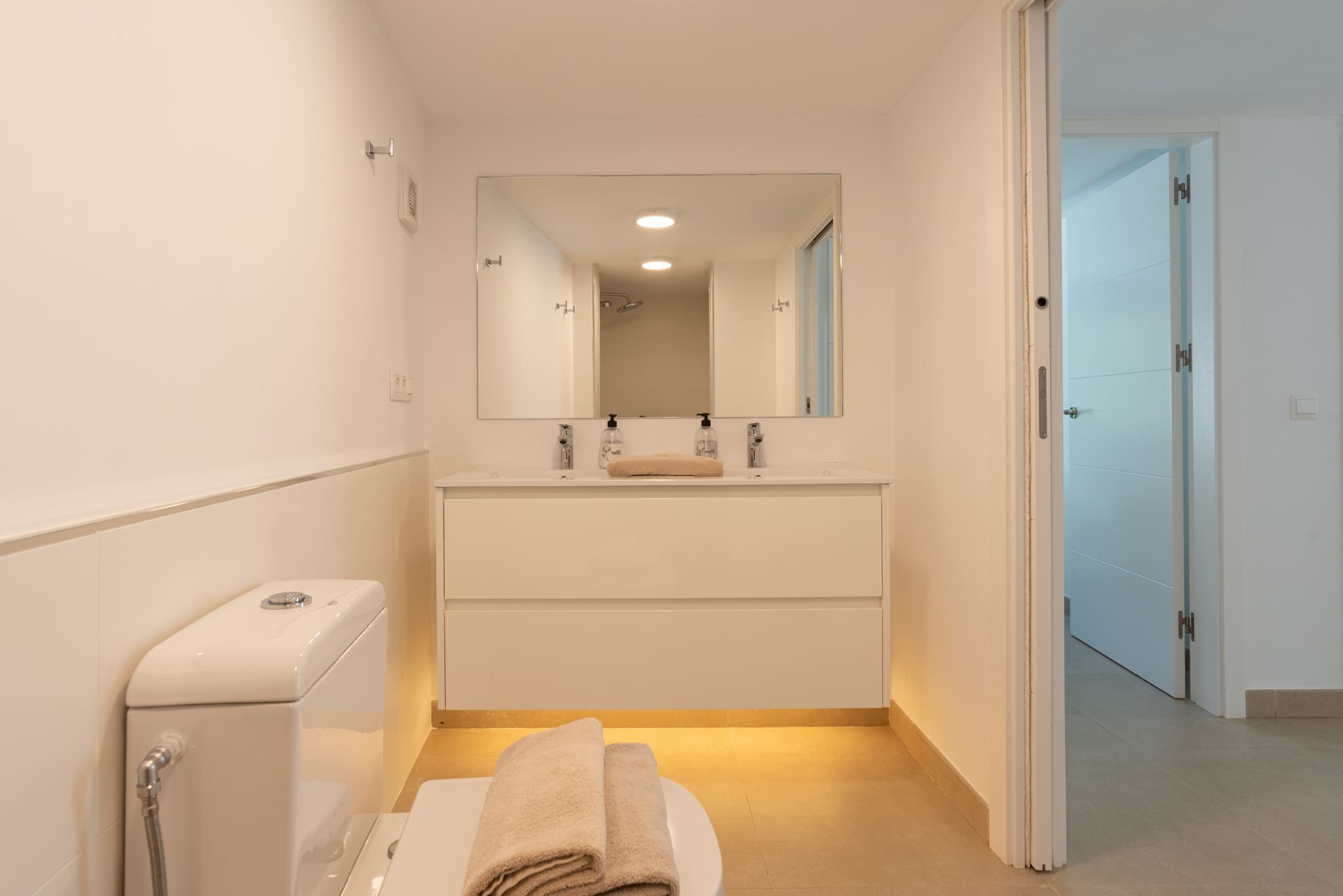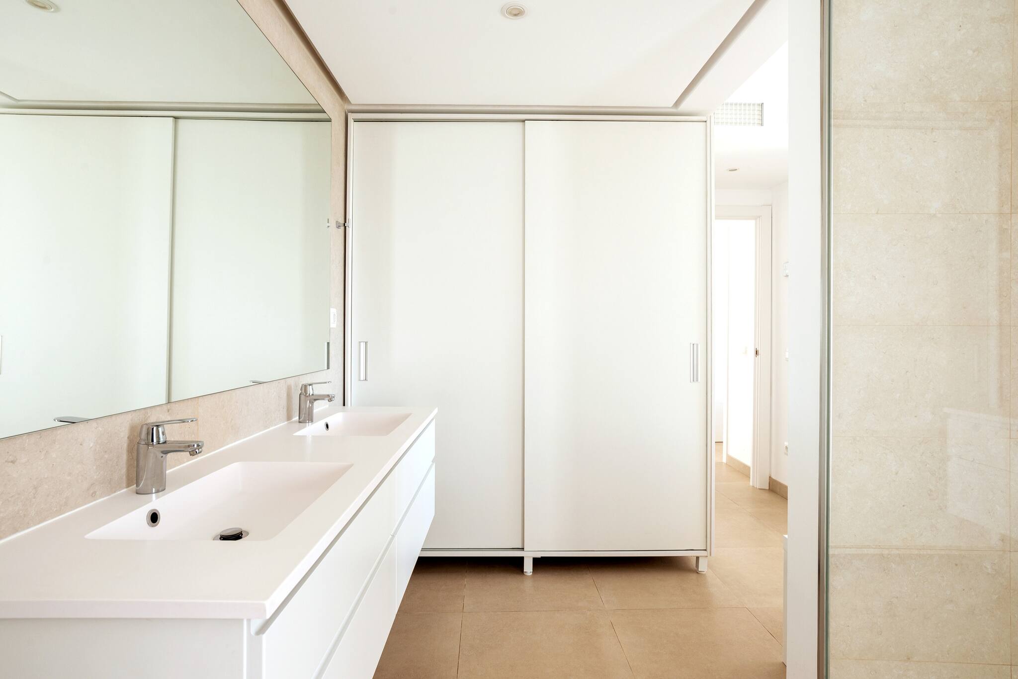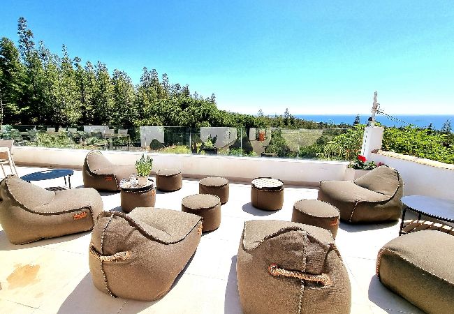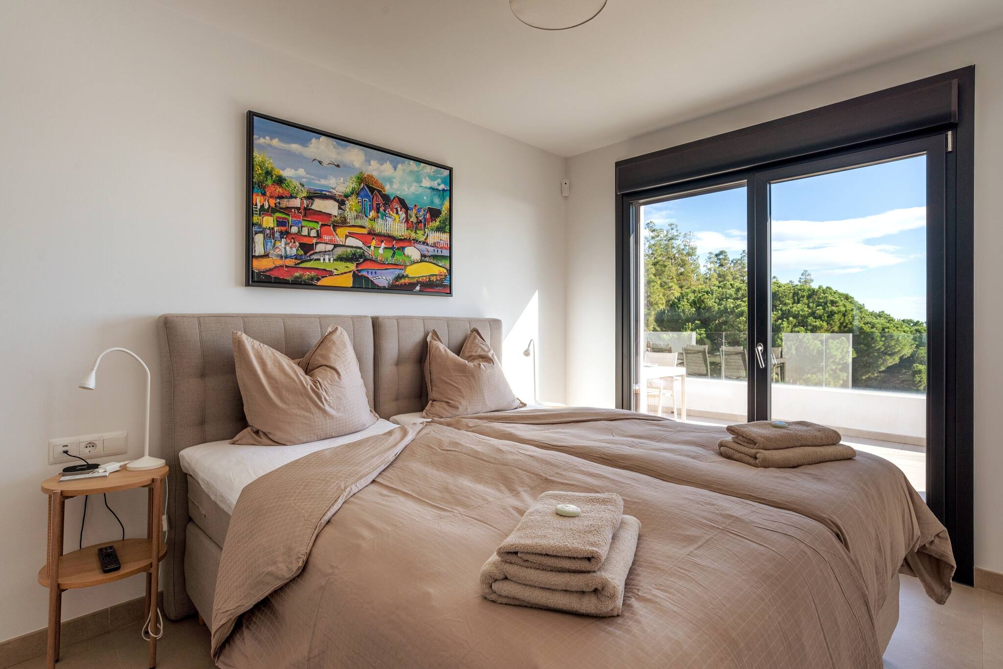 På øverste etage ligger den imponerende mastersuite med direkte adgang til privat terrasse og solarium, hvor du kan nyde panoramaudsigt over havet og bjergene. Etagen rummer desuden et stort en-suite badeværelse, indbyggede skabe og et lille arbejdsområde – perfekt hvis du har brug for at arbejde under opholdet.