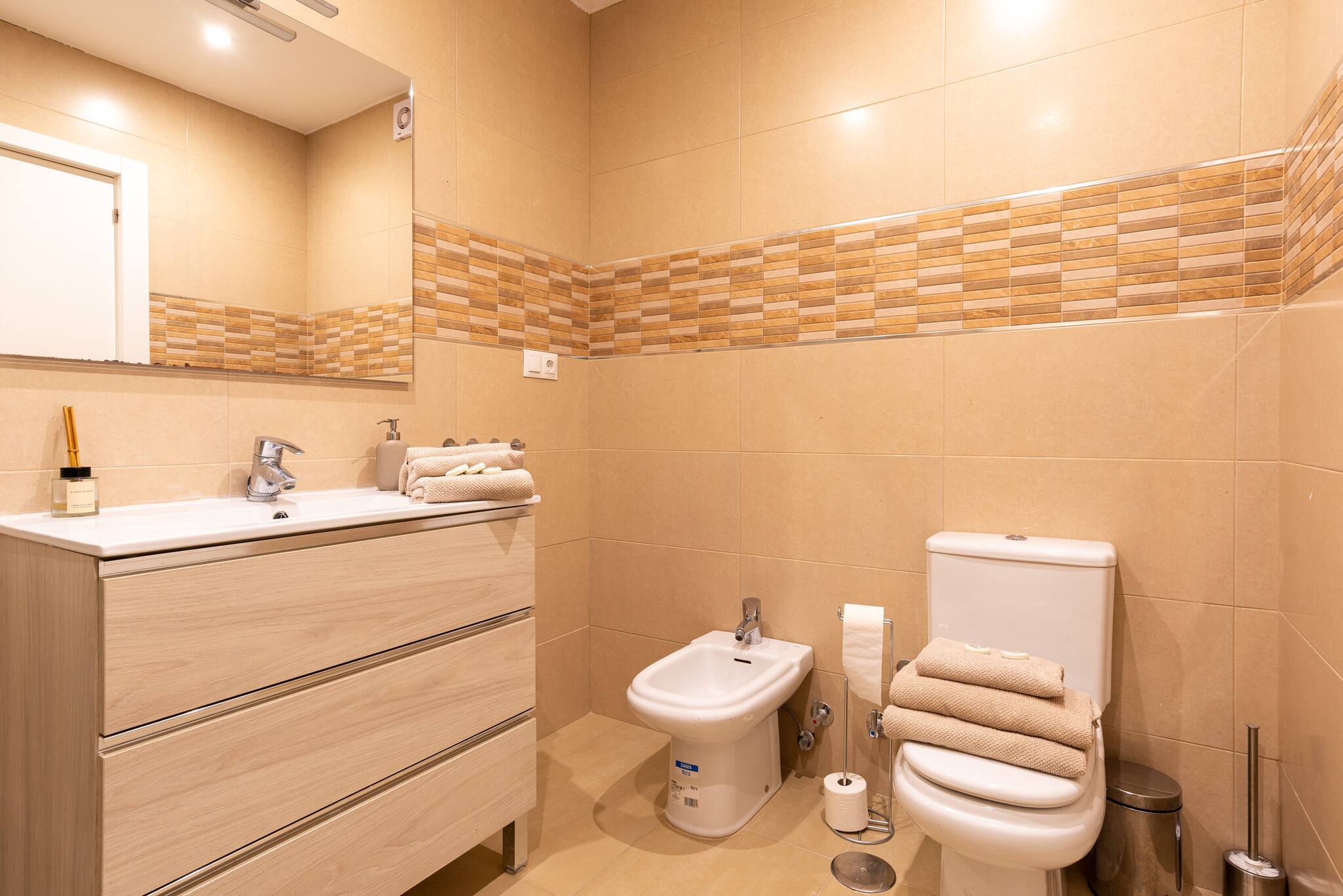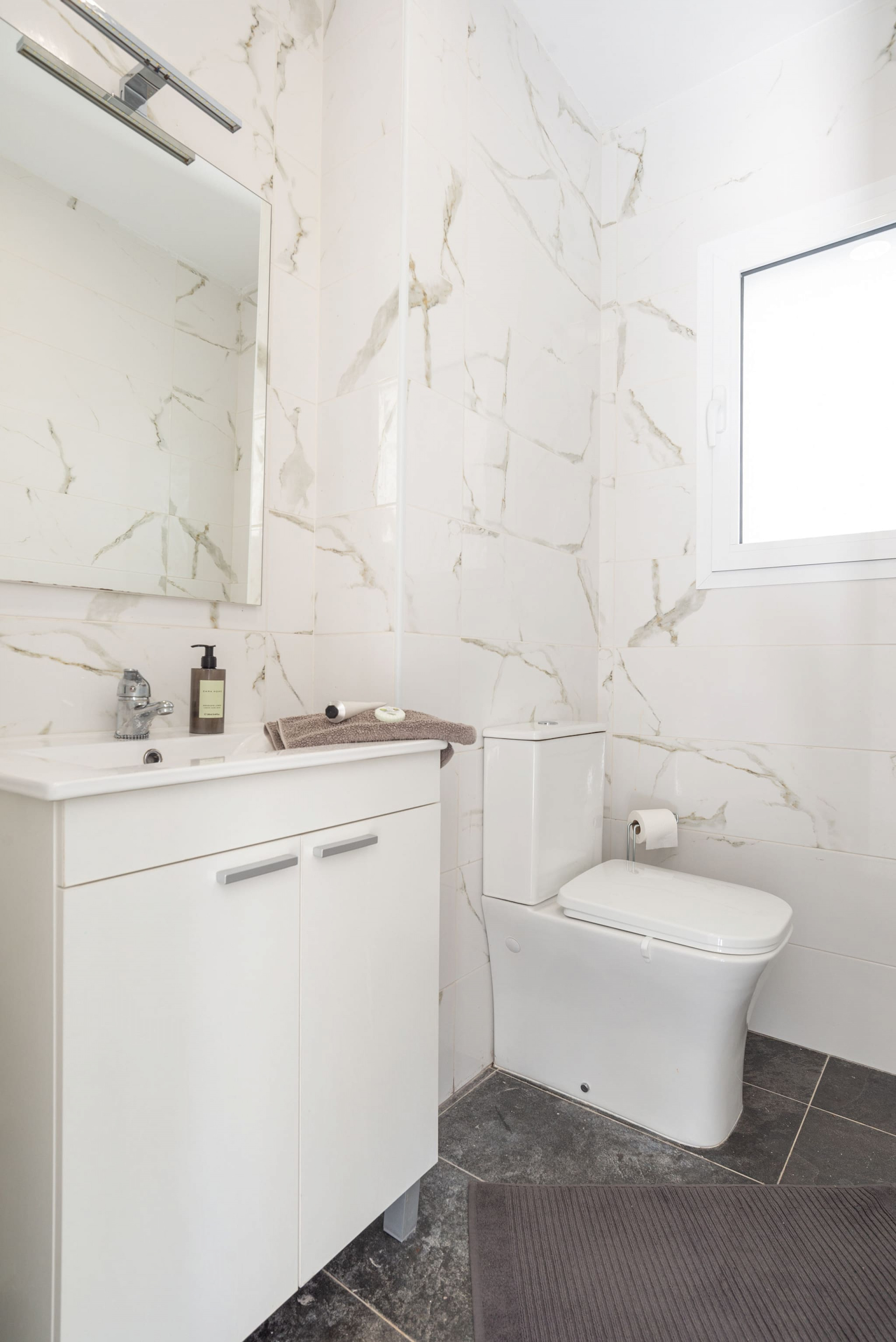 Stort fuld udstyret moderne åbent køkken med spiseplads, stue med hjørnesofa og tv. På denne etage har du også et toilet. Der er udgang til dejlig stor terrasse med laungemøbler, grill og smuk udsigt ud til Middelhavet. Herfra går der trapper ned til pool området.