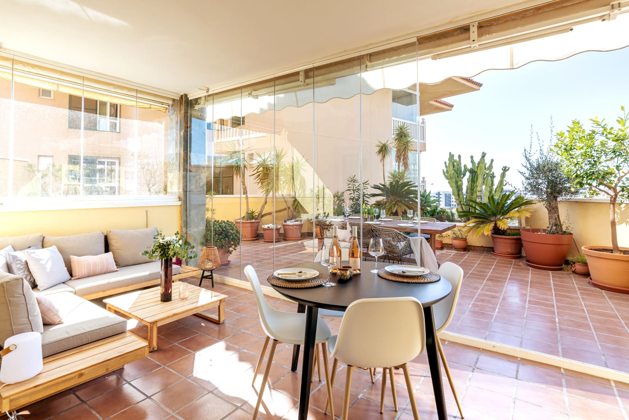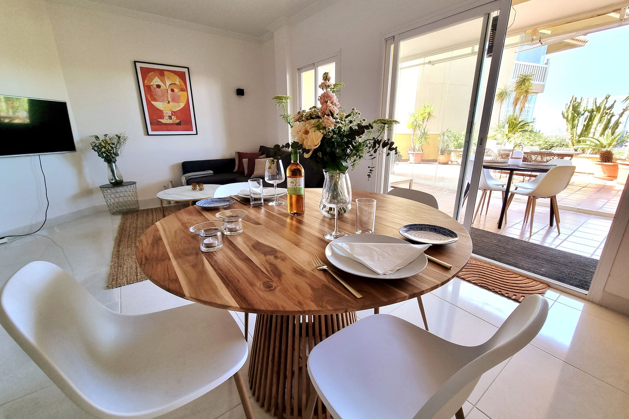 Modern living room with dining area and access to 2 lovely terraces, one with a view of the mountains and the pool area and the other with a view of the city and the Mediterranean.