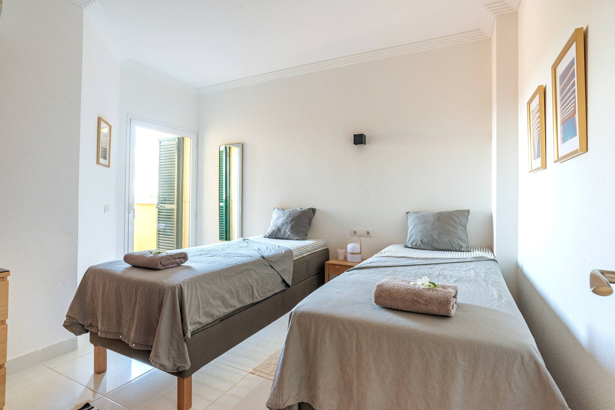 The apartment consists of 2 bedrooms, both with built-in wardrobes and 2 bathrooms. Both bedrooms have single beds which can of course be put together to make double beds. One bathroom has a bathtub and the other has a shower. Living room with sofa bed and open fully equipped kitchen.
