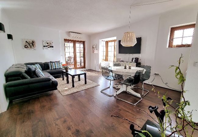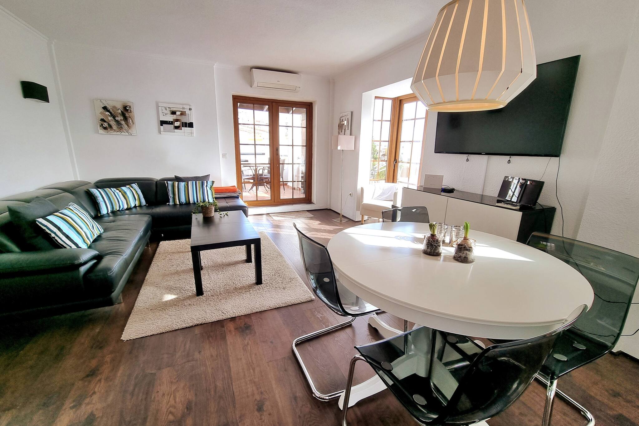 Modern living room with dining area and access to 2 lovely terraces, one with a view of the mountains and the pool area and the other with a view of the city and the Mediterranean.