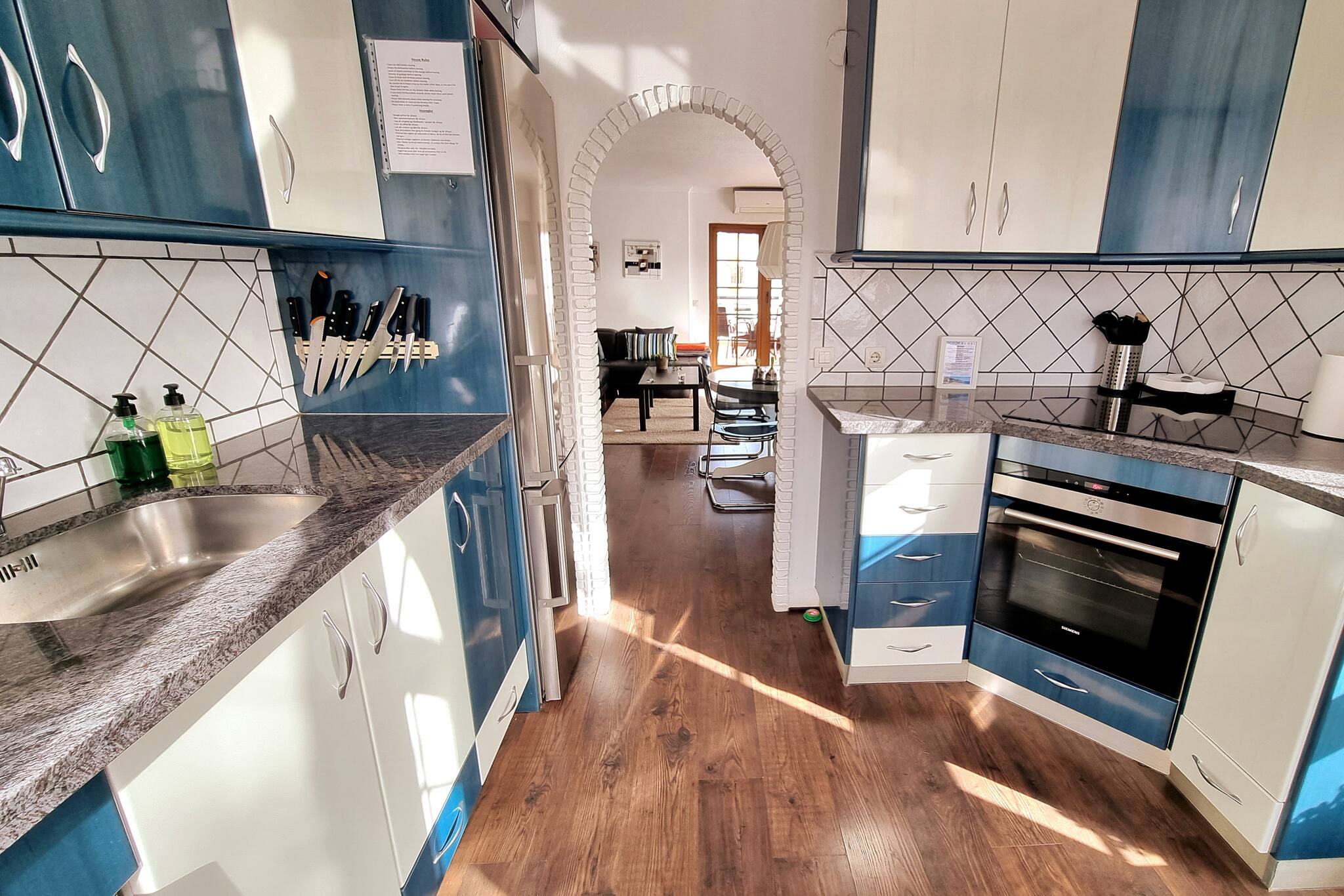 In the living room there is a dining area, a sofa (sofa bed ) and a fully equipped open kitchen. Exit to the conservatory with a view of the Mediterranean, where you can sit and enjoy the Spanish evenings. On this floor there is also a toilet. There is a television with Danish, Swedish, Norwegian and English channels. Also free wifi.