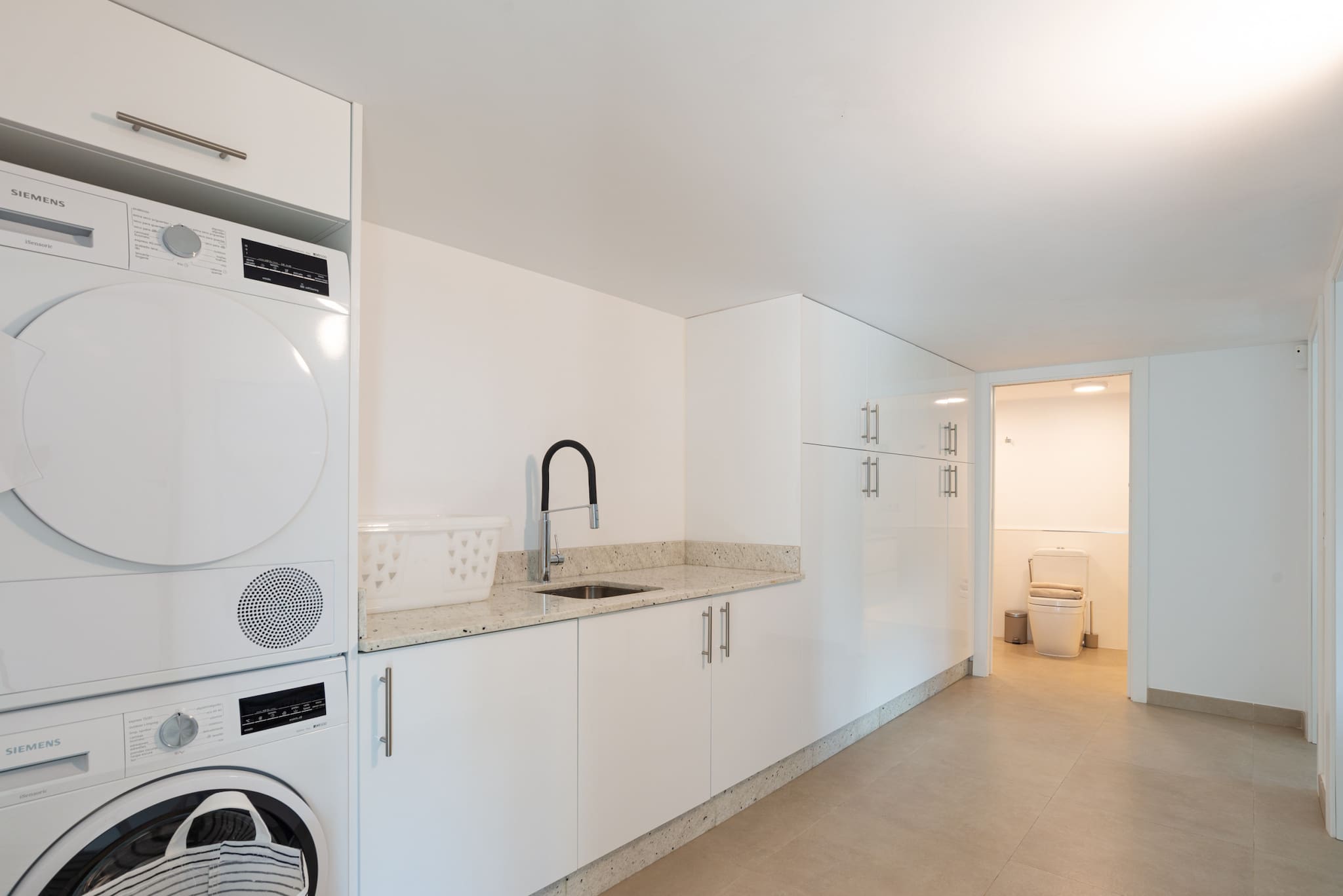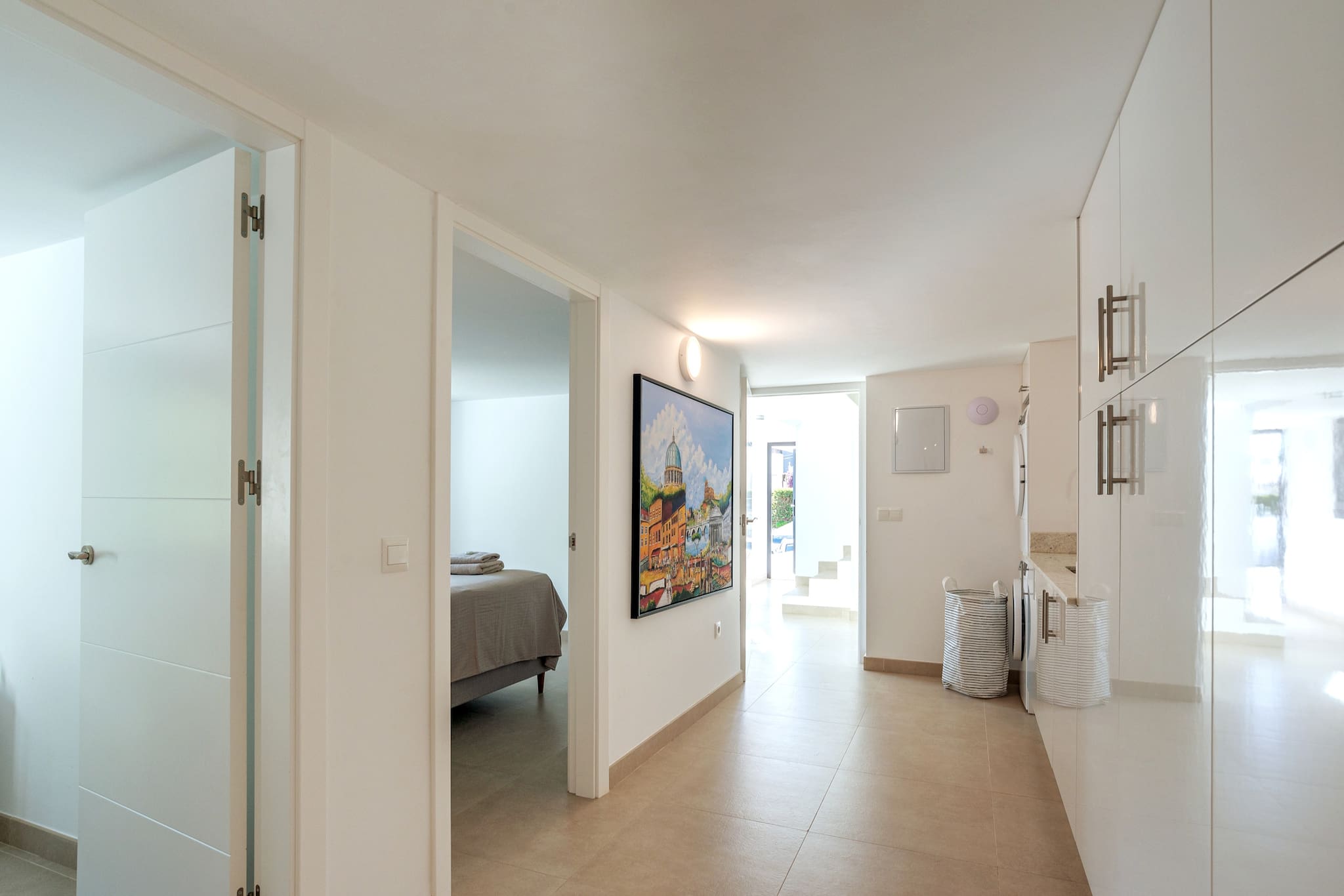 Upstairs, the stunning master suite offers direct access to a private terrace and solarium, where you can soak up panoramic views of the sea and mountains. This floor also includes a large en-suite bathroom, fitted wardrobes, and a small workspace — perfect if you need to work.